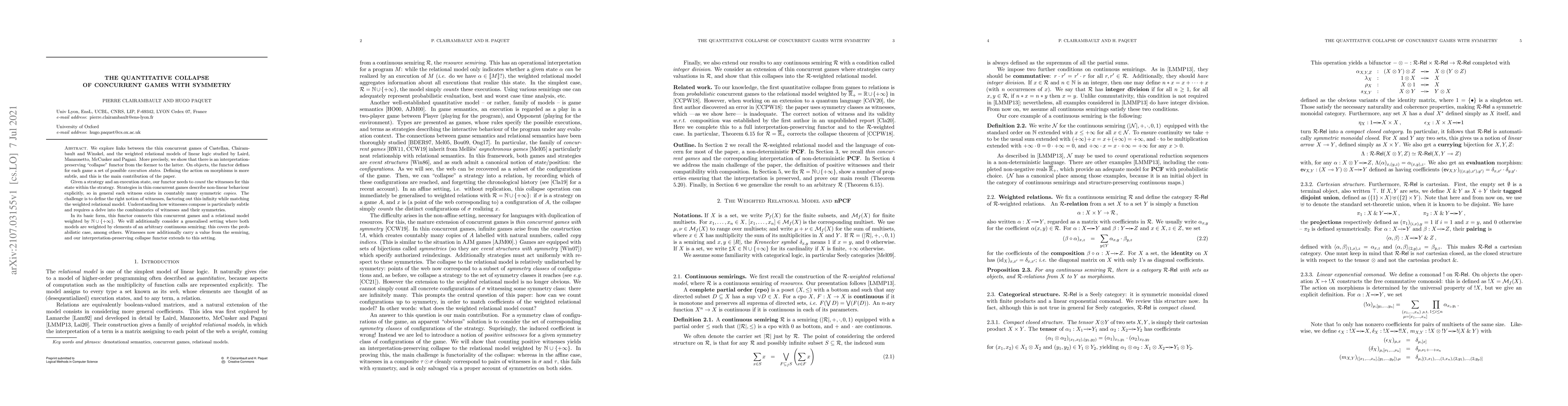This paper establishes a "collapse" functor that interprets thin concurrent games into weighted relational models of linear logic, focusing on counting symmetric witnesses within strategies. It extends to a generalized setting with continuous semiring weights, including probabilistic cases.