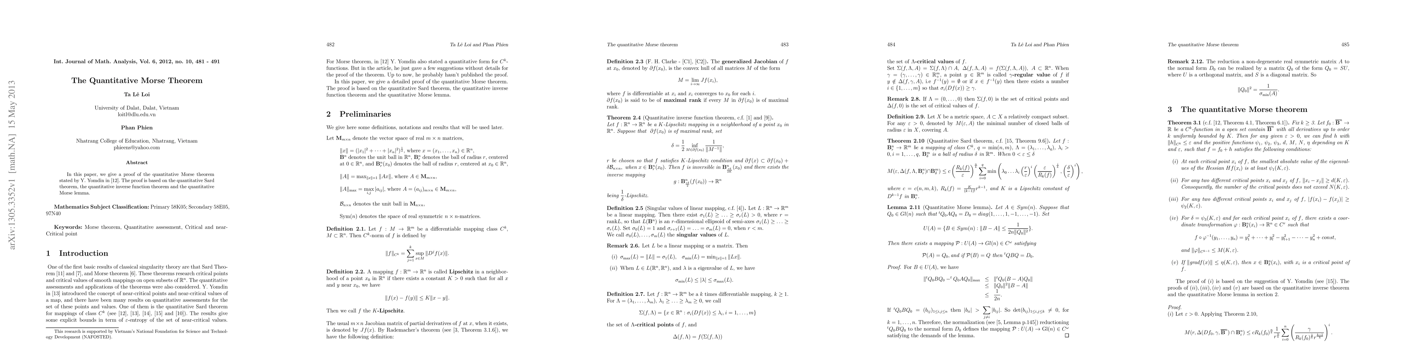 Summary: This paper provides a proof of Yomdin's quantitative Morse theorem using the quantitative Sard theorem, the quantitative inverse function theorem, and the quantitative Morse lemma. The approach emphasizes quantitative aspects in differential topology.