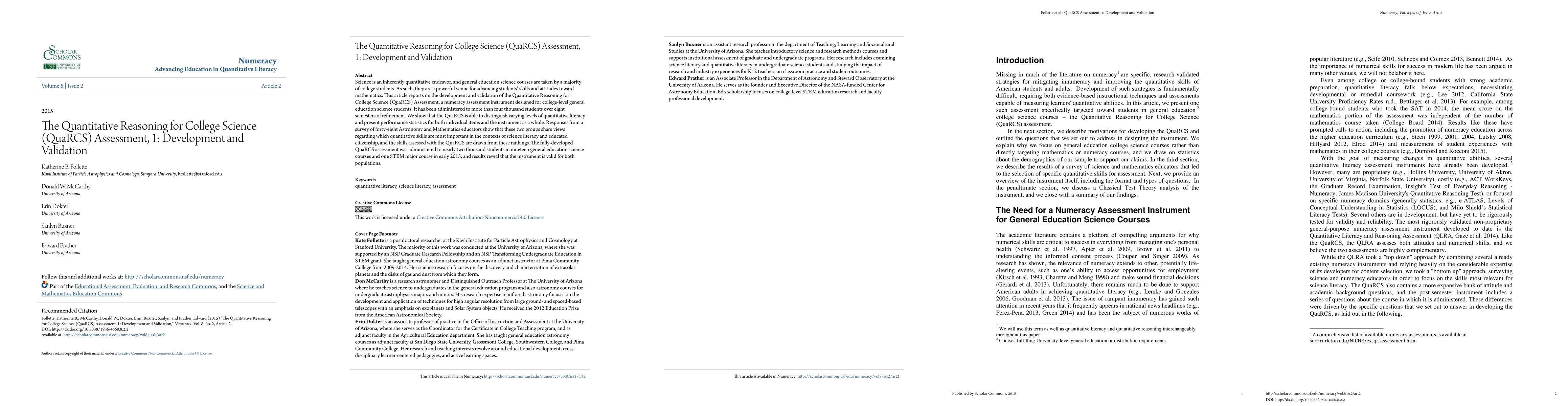 The QuaRCS Assessment was developed to measure quantitative literacy in college science students, validated through administration to over four thousand students, and shown to effectively distinguish varying levels of numeracy. Educator surveys confirmed alignment with important quantitative skills, and results from nearly two thousand students validated its effectiveness across general education and STEM courses.