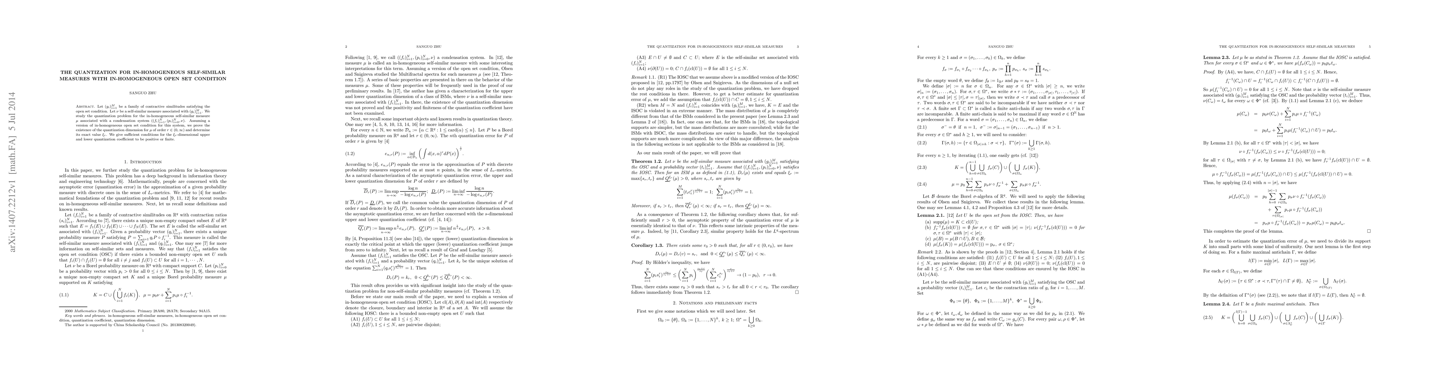 This paper investigates the quantization of in-homogeneous self-similar measures under an in-homogeneous open set condition, proving the existence and determining the exact value of the quantization dimension for a given order, and providing conditions for the positivity or finiteness of the quantization coefficients.