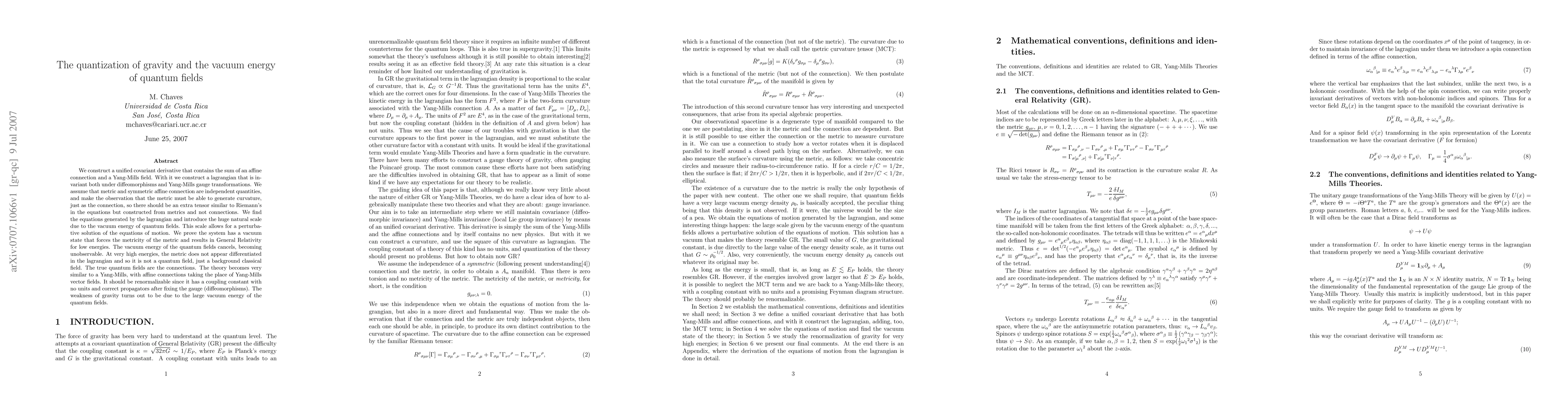 We construct a unified covariant derivative that contains the sum of an affine connection and a Yang-Mills field. With it we construct a lagrangian that is invariant both under diffeomorphisms and Yang-Mills gauge transformations. We assume that metric and symmetric affine connection are independent quantities, and make the observation that the metric must be able to generate curvature, just as the connection, so there should be an extra tensor similar to Riemann's in the equations but constructed from metrics and not connections. We find the equations generated by the lagrangian and introduce the huge natural scale due to the vacuum energy of quantum fields. This scale allows for a perturbative solution of the equations of motion. We prove the system has a vacuum state that forces the metricity of the metric and results in General Relativity for low energies. The vacuum energy of the quantum fields cancels, becoming unobservable. At very high energies, the metric does not appear differentiated in the lagrangian and so it is not a quantum field, just a background classical field. The true quantum fields are the connections. The theory becomes very similar to a Yang-Mills, with affine connections taking the place of Yang-Mills vector fields. It should be renormalizable since it has a coupling constant with no units and correct propagators after fixing the gauge (diffeomorphisms). The weakness of gravity turns out to be due to the large vacuum energy of the quantum fields.