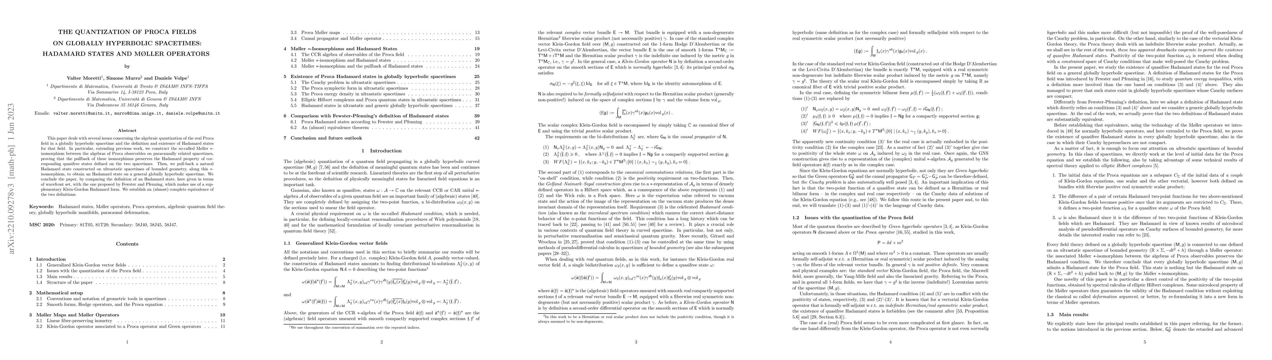 This paper quantizes the Proca field on globally hyperbolic spacetimes, constructing M{\o}ller $*$-isomorphisms that preserve the Hadamard property, and extends a Hadamard state from ultrastatic spacetimes to general ones. It also compares two definitions of Hadamard states, establishing their equivalence.
