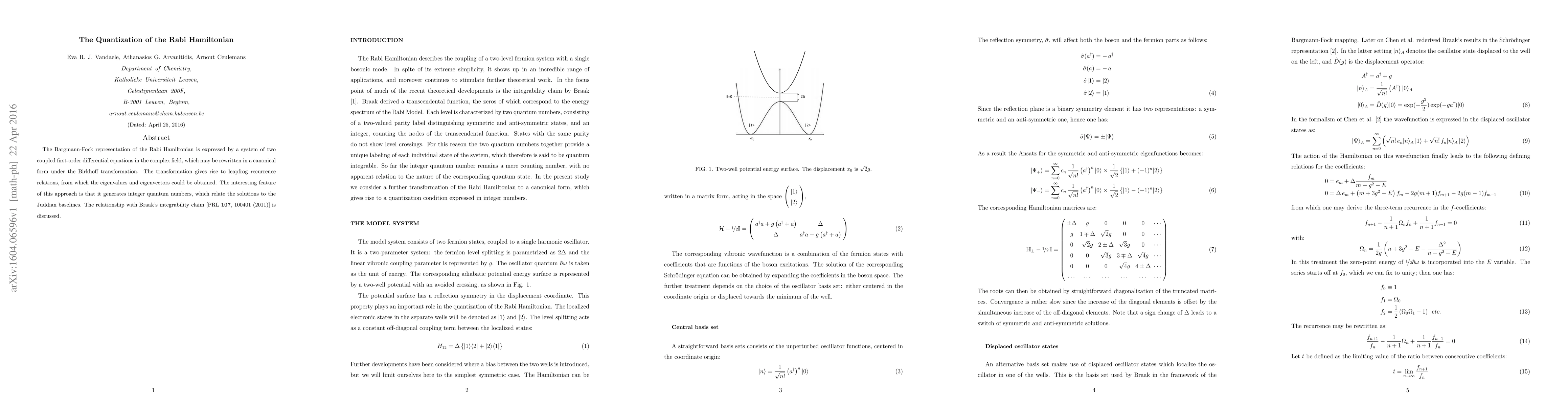 This paper quantizes the Rabi Hamiltonian using the Bargmann-Fock representation, transforming it into a canonical form via the Birkhoff transformation. This generates integer quantum numbers and supports Braak's claim of integrability, linking solutions to Juddian baselines.