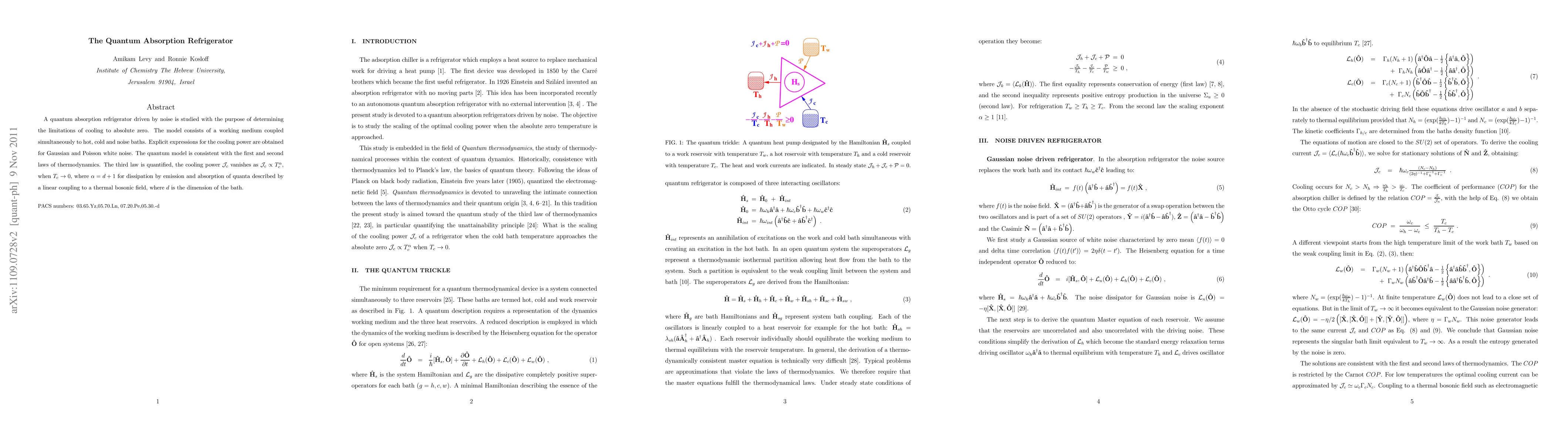 This paper investigates a quantum absorption refrigerator driven by noise, aiming to explore the limits of cooling to absolute zero. It provides explicit expressions for cooling power under Gaussian and Poisson white noise, confirming the model's compliance with thermodynamic laws and quantifying the vanishing cooling power as temperature approaches zero.