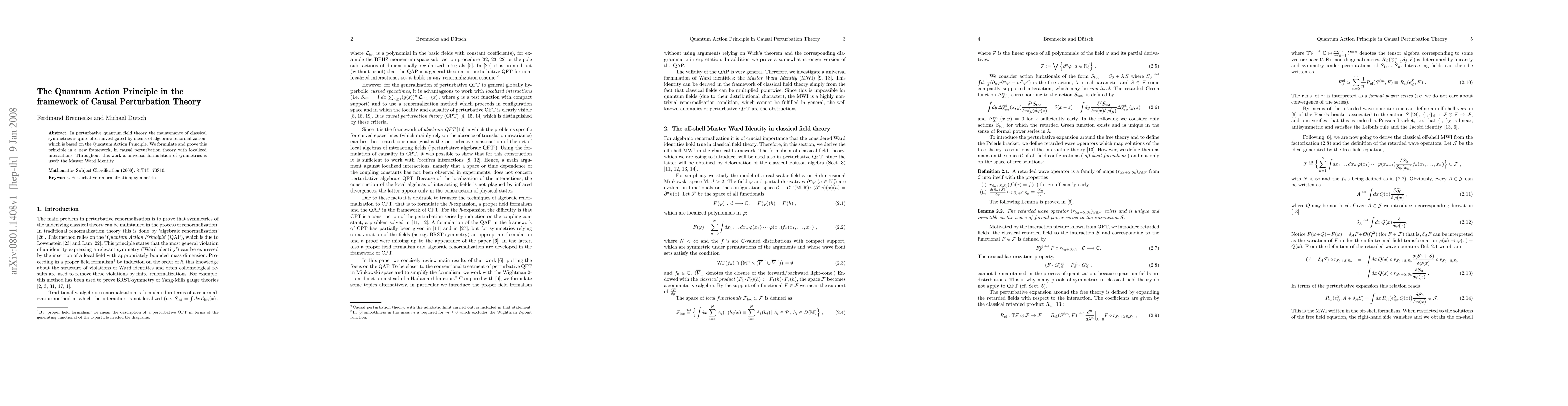 This paper formulates and proves the Quantum Action Principle within causal perturbation theory, focusing on localized interactions and employing the Master Ward Identity for a universal symmetry formulation. The work aims to maintain classical symmetries in perturbative quantum field theory.