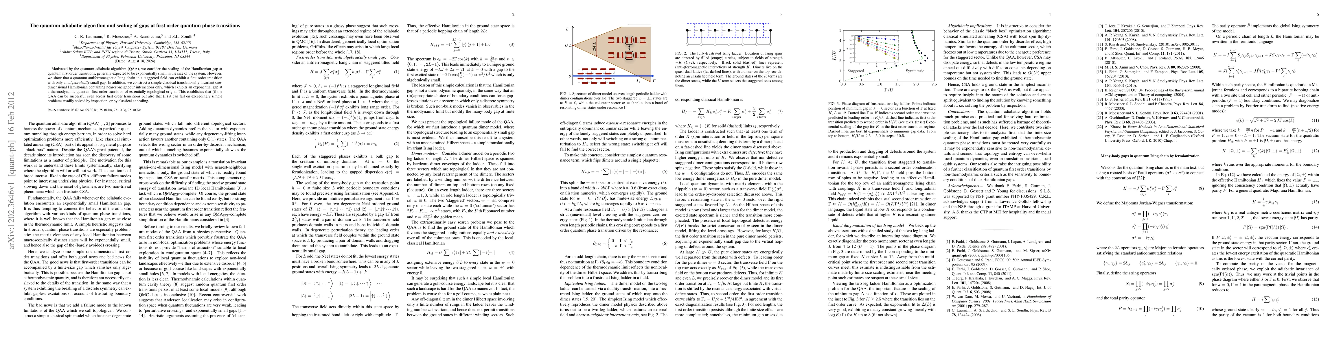 Motivated by the quantum adiabatic algorithm (QAA), we consider the scaling of the Hamiltonian gap at quantum first order transitions, generally expected to be exponentially small in the size of the system. However, we show that a quantum antiferromagnetic Ising chain in a staggered field can exhibit a first order transition with only an algebraically small gap. In addition, we construct a simple classical translationally invariant one-dimensional Hamiltonian containing nearest-neighbour interactions only, which exhibits an exponential gap at a thermodynamic quantum first-order transition of essentially topological origin. This establishes that (i) the QAA can be successful even across first order transitions but also that (ii) it can fail on exceedingly simple problems readily solved by inspection, or by classical annealing.