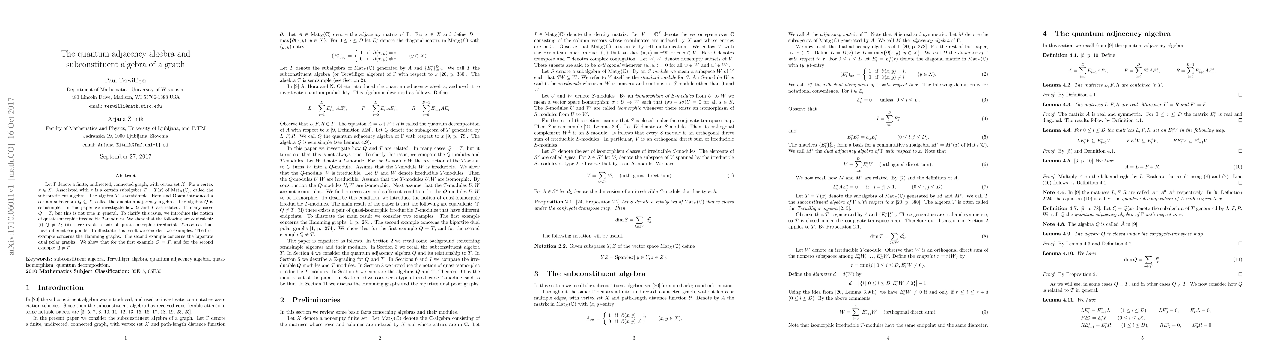 The paper investigates the relationship between the quantum adjacency algebra (Q) and the subconstituent algebra (T) of a graph, using concepts from algebra and graph theory.