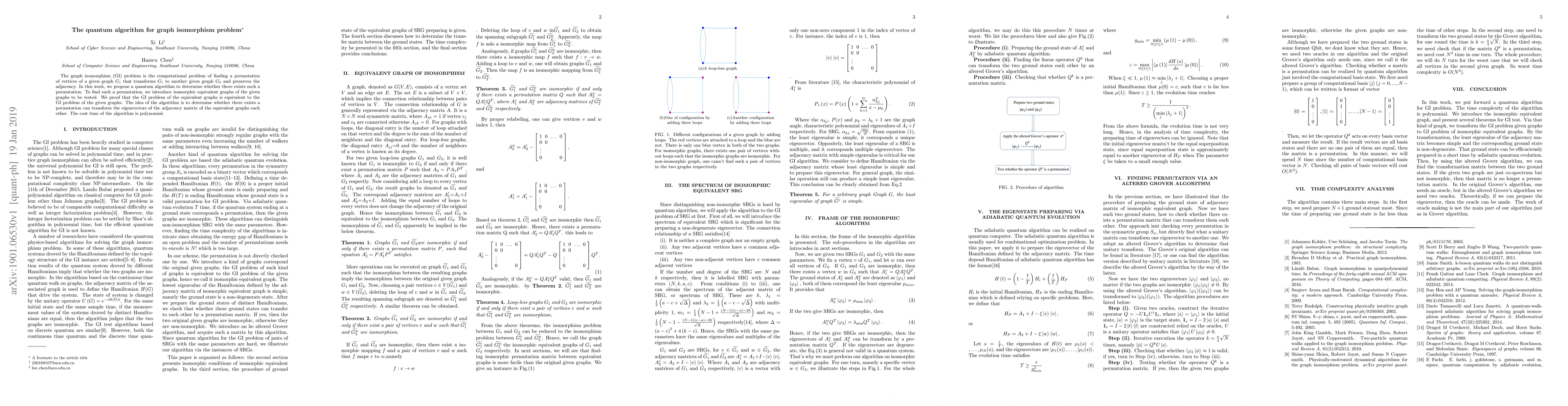 This paper proposes a quantum algorithm to solve the graph isomorphism problem efficiently by determining if there exists a permutation that transforms one graph into another, leveraging the properties of the adjacency matrix and its eigenvectors. The algorithm's time complexity is polynomial.