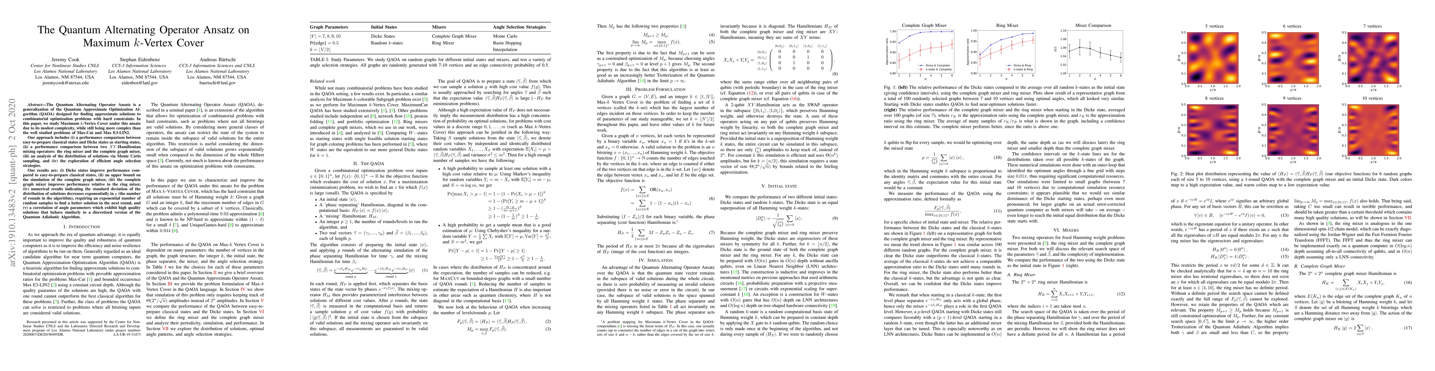 This paper investigates the Quantum Alternating Operator Ansatz for solving Maximum $k$-Vertex Cover, comparing classical and Dicke states, two $XY$-Hamiltonian mixers, and angle selection strategies. Results show Dicke states outperform classical states, the complete graph mixer is superior, and the solution distribution's standard deviation decreases exponentially with algorithm rounds.