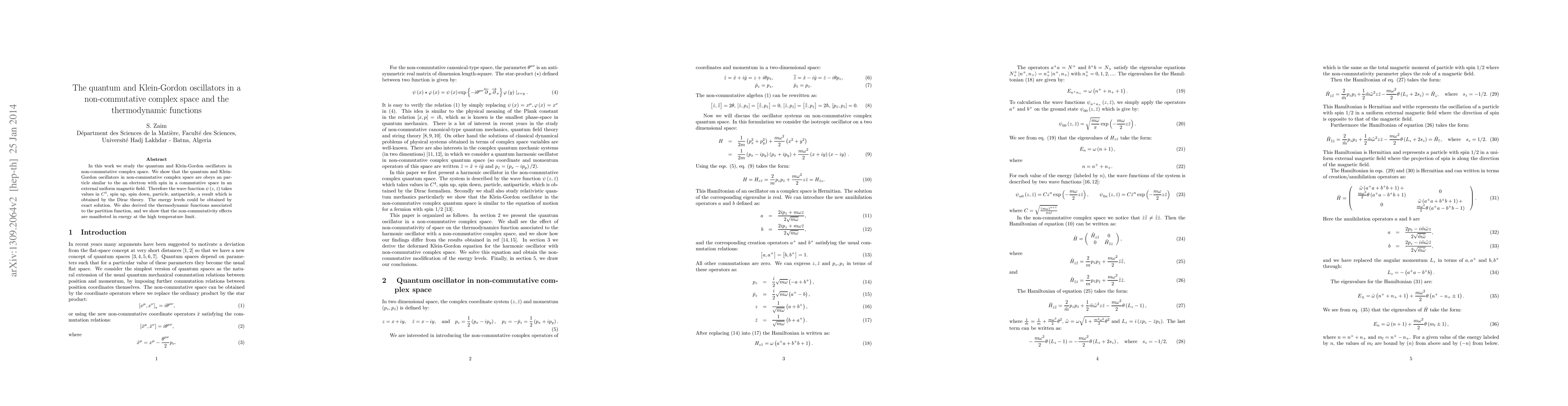 In this work we study the quantum and Klein-Gordon oscillators in non-commutative complex space. We show that the quantum oscillator in non-commutative complex space obeys an equation similar to the equation of motion of an electron with spin in a commutative space in an external uniform magnetic field. Therefore the wave function ${\psi}(z,\bar{z}) $ takes values in $C^{4}$, spin up, spin down, particle, antiparticle, a result which is obtained by the Dirac theory. We derive the thermodynamic functions associated to the partition function. We show that the non-commutativity affects energy at the high temperature limit. The Klein Gordon oscillator in non-commutative complex space also has a similar equation of motion to that a fermions with spin 1/2 in a commutative space in a constant magnetic field. The energy levels could be obtained by exact solution.