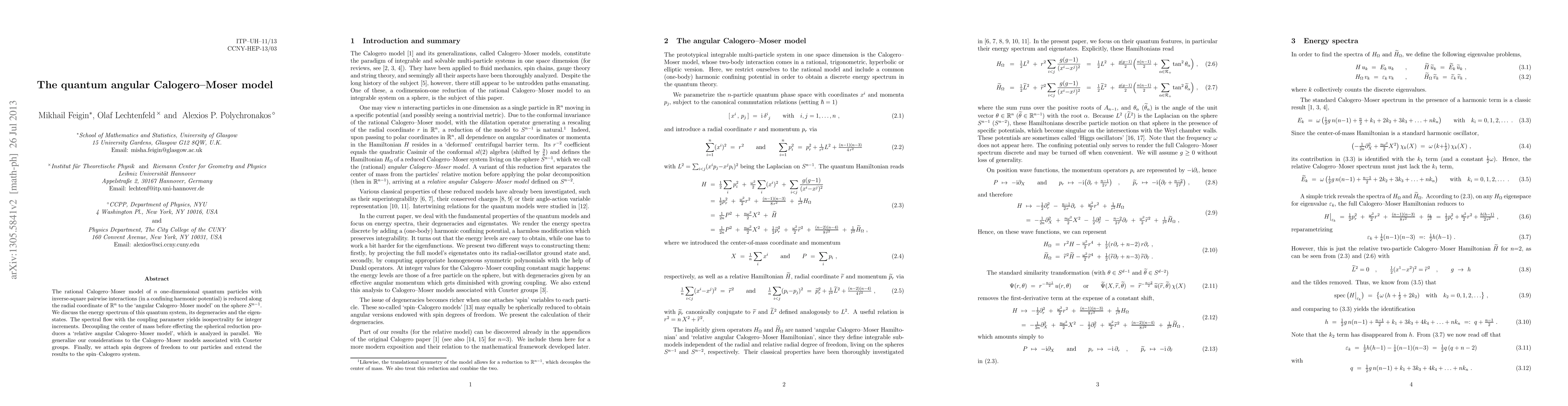The rational Calogero-Moser model of n one-dimensional quantum particles with inverse-square pairwise interactions (in a confining harmonic potential) is reduced along the radial coordinate of R^n to the `angular Calogero-Moser model' on the sphere S^{n-1}. We discuss the energy spectrum of this quantum system, its degeneracies and the eigenstates. The spectral flow with the coupling parameter yields isospectrality for integer increments. Decoupling the center of mass before effecting the spherical reduction produces a `relative angular Calogero-Moser model', which is analyzed in parallel. We generalize our considerations to the Calogero-Moser models associated with Coxeter groups. Finally, we attach spin degrees of freedom to our particles and extend the results to the spin-Calogero system.