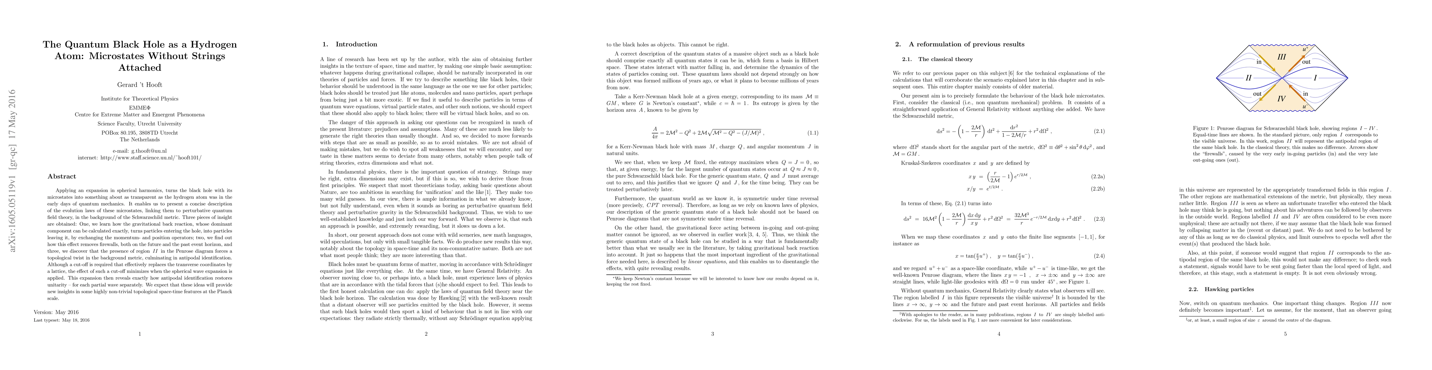 Applying an expansion in spherical harmonics, turns the black hole with its microstates into something about as transparent as the hydrogen atom was in the early days of quantum mechanics. It enables us to present a concise description of the evolution laws of these microstates, linking them to perturbative quantum field theory, in the background of the Schwarzschild metric. Three pieces of insight are obtained: One, we learn how the gravitational back reaction, whose dominant component can be calculated exactly, turns particles entering the hole, into particles leaving it, by exchanging the momentum- and position operators; two, we find out how this effect removes firewalls, both on the future and the past event horizon, and three, we discover that the presence of region II in the Penrose diagram forces a topological twist in the background metric, culminating in antipodal identification. Although a cut-off is required that effectively replaces the transverse coordinates by a lattice, the effect of such a cut-off minimizes when the spherical wave expansion is applied. This expansion then reveals exactly how antipodal identification restores unitarity - for each partial wave separately. We expect that these ideas will provide new insights in some highly non-trivial topological space-time features at the Planck scale.