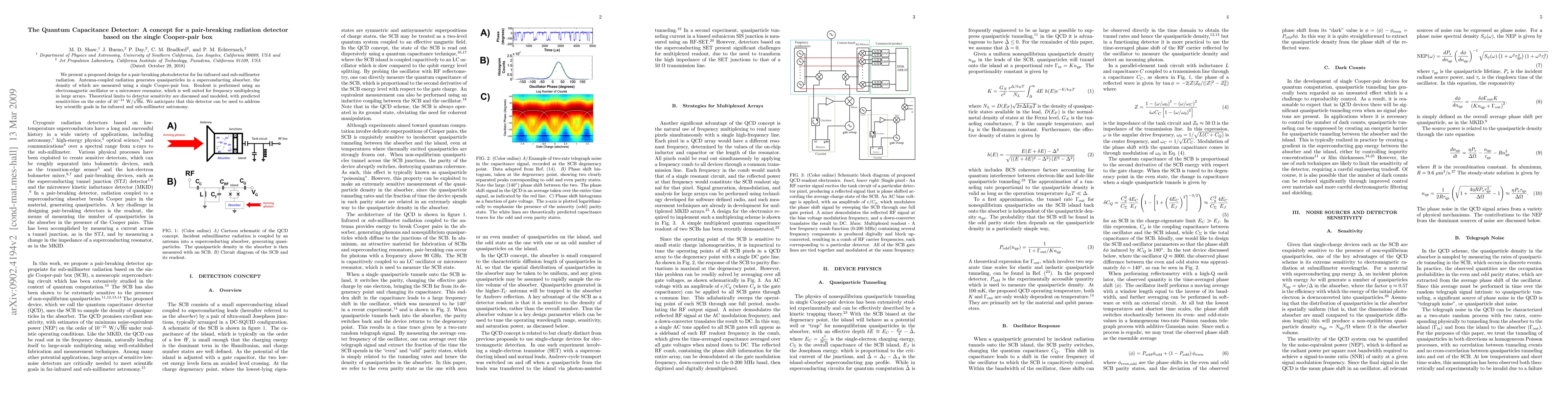 The Quantum Capacitance Detector proposes a novel pair-breaking photodetector for far-infrared and sub-millimeter radiation using a single Cooper-pair box to measure quasiparticle density. The detector's sensitivity is theoretically comparable to existing technologies, promising significant advancements in far-infrared and sub-millimeter astronomy.