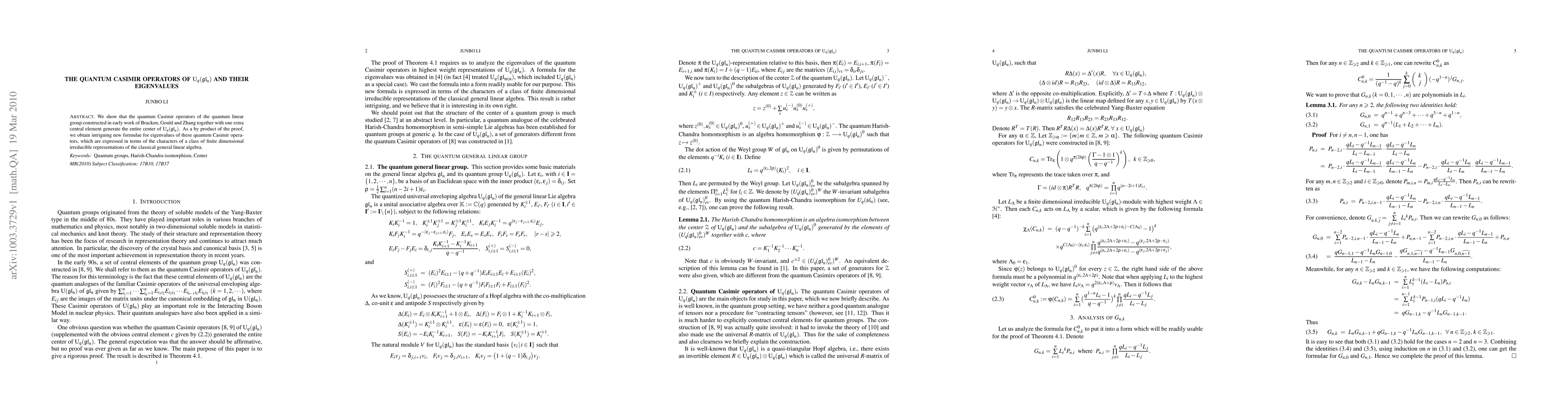 We show that the quantum Casimir operators of the quantum linear group constructed in early work of Bracken, Gould and Zhang together with one extra central element generate the entire center of $\Uq$. As a by product of the proof, we obtain intriguing new formulae for eigenvalues of these quantum Casimir operators, which are expressed in terms of the characters of a class of finite dimensional irreducible representations of the classical general linear algebra.