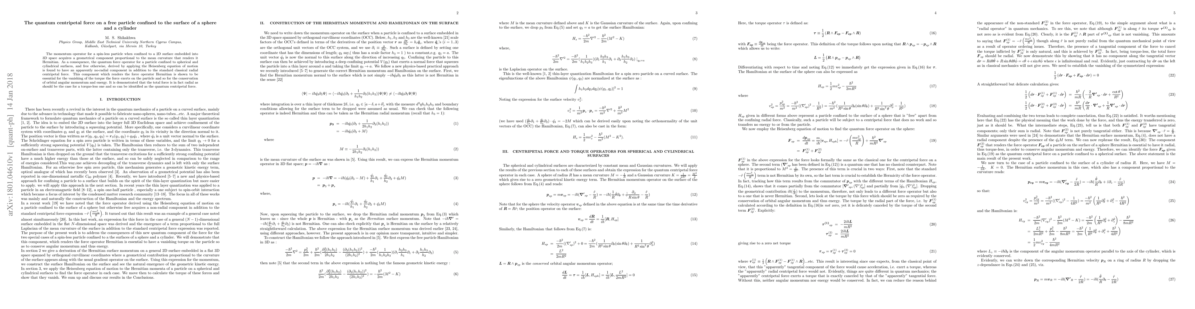 The momentum operator for a spin-less particle when confined to a 2D surface embedded into 3D space acquires a geometrical component proportional to the mean curvature that renders it Hermitian. As a consequence, the quantum force operator for a particle confined to spherical and cylindrical surfaces, and free otherwise, derived by applying the Heisenberg equation of motion is found to have an apparently no-radial component in addition to the standard classical radial centripetal force. This component which renders the force operator Hermitian is shown to be essential for the vanishing of the torque the force exerts on the particle and so for the conservation of orbital angular momentum and energy. It is demonstrated that the total force is in fact radial as should be the case for a torque-less one and so can be identified as the quantum centripetal force.