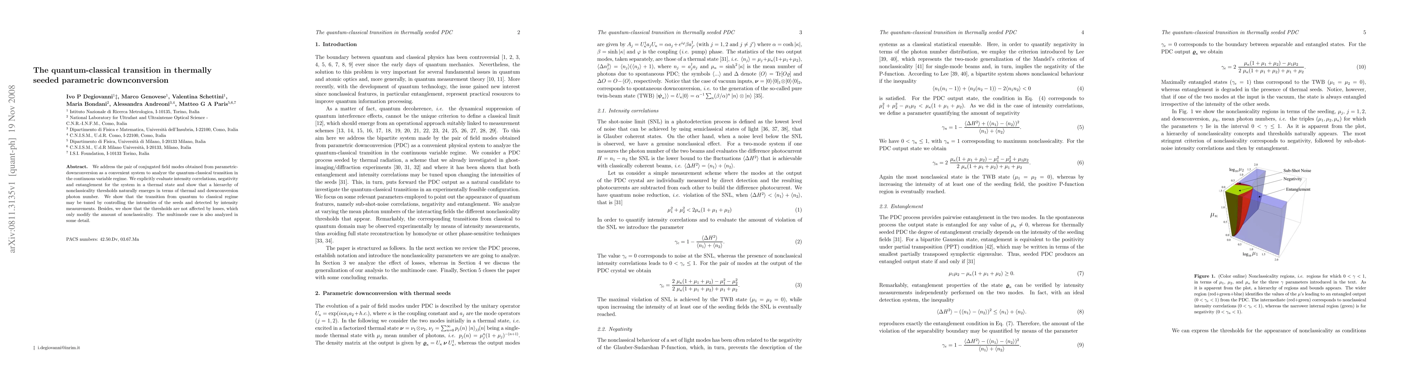 This paper investigates the quantum-classical transition in parametric downconversion using conjugated field modes, demonstrating how nonclassicality thresholds emerge based on thermal and downconversion photon numbers. The transition can be tuned by adjusting seed intensities and is unaffected by losses, which only alter the degree of nonclassicality.