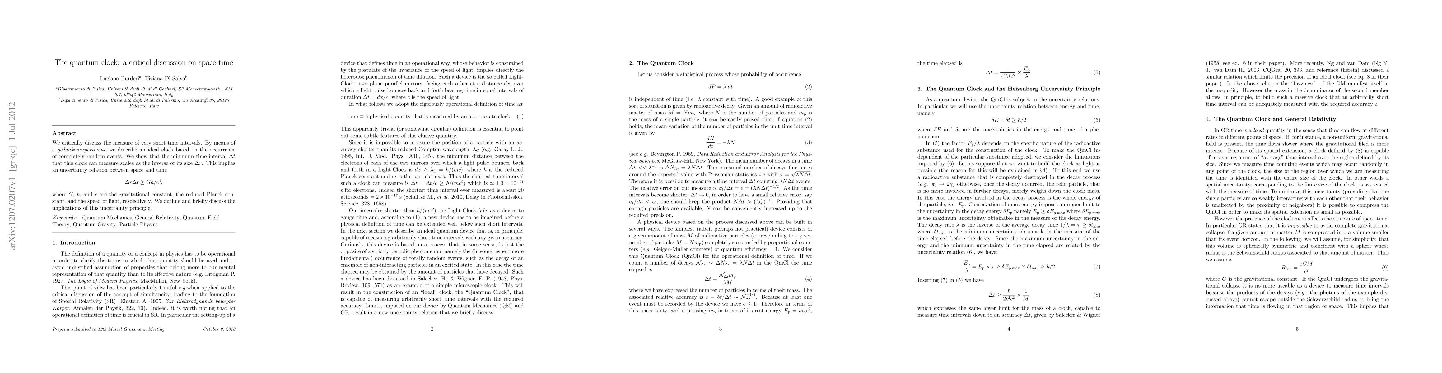 We critically discuss the measure of very short time intervals. By means of a "gedankenexperiment", we describe an ideal clock based on the occurrence of completely random events. We show that the minimum time interval Delta t that this clock can measure scales as the inverse of its size Delta r. This implies an uncertainty relation between space and time: Delta r Delta t > G \hbar / c^4, where G, \hbar, and c are the Gravitational constant, the reduced Planck constant, and the speed of light, respectively. We outline and briefly discuss the implications of this uncertainty principle.