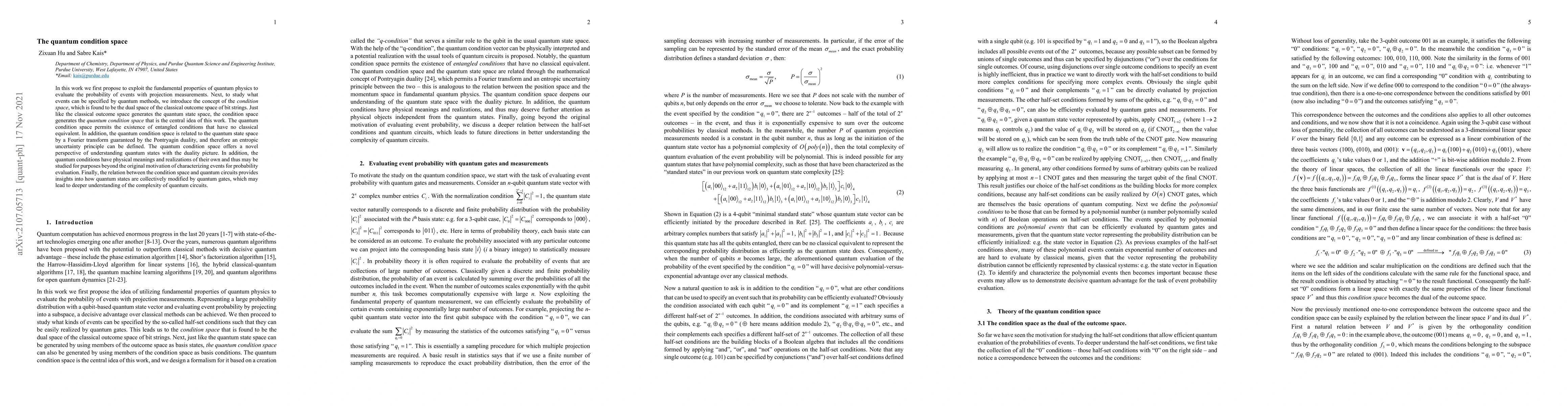 In this work we first propose to exploit the fundamental properties of quantum physics to evaluate the probability of events with projection measurements. Next, to study what events can be specified by quantum methods, we introduce the concept of the condition space, which is found to be the dual space of the classical outcome space of bit strings. Just like the classical outcome space generates the quantum state space, the condition space generates the quantum condition space that is the central idea of this work. The quantum condition space permits the existence of entangled conditions that have no classical equivalent. In addition, the quantum condition space is related to the quantum state space by a Fourier transform guaranteed by the Pontryagin duality, and therefore an entropic uncertainty principle can be defined. The quantum condition space offers a novel perspective of understanding quantum states with the duality picture. In addition, the quantum conditions have physical meanings and realizations of their own and thus may be studied for purposes beyond the original motivation of characterizing events for probability evaluation. Finally, the relation between the condition space and quantum circuits provides insights into how quantum states are collectively modified by quantum gates, which may lead to deeper understanding of the complexity of quantum circuits.