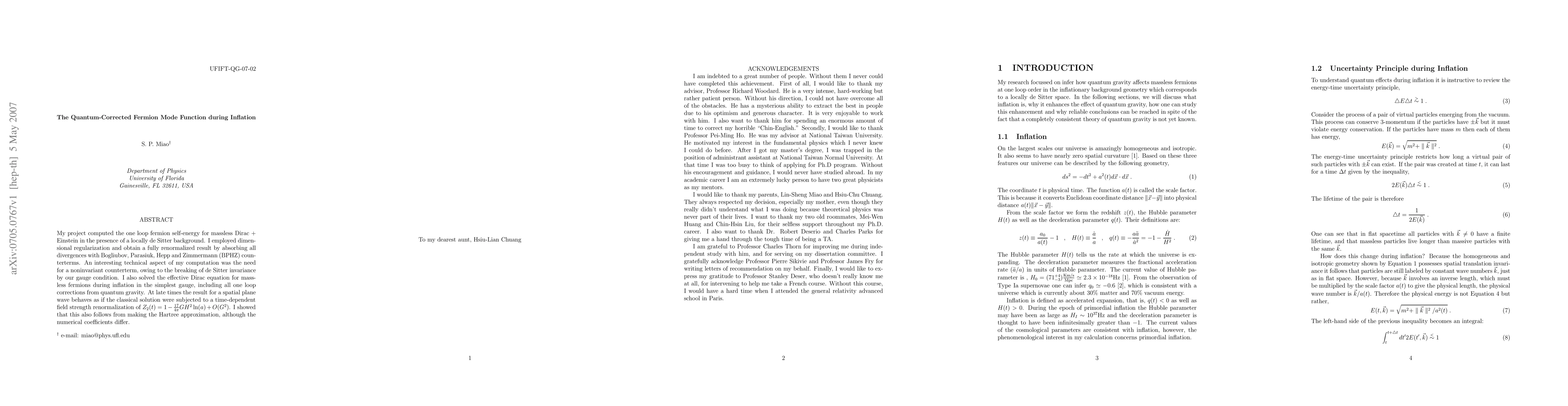 My project computed the one loop fermion self-energy for massless Dirac + Einstein in the presence of a locally de Sitter background. I employed dimensional regularization and obtain a fully renormalized result by absorbing all divergences with Bogliubov, Parasiuk, Hepp and Zimmermann (BPHZ) counterterms. An interesting technical aspect of my computation was the need for a noninvariant counterterm, owing to the breaking of de Sitter invariance by our gauge condition. I also solved the effective Dirac equation for massless fermions during inflation in the simplest gauge, including all one loop corrections from quantum gravity. At late times the result for a spatial plane wave behaves as if the classical solution were subjected to a time-dependent field strength renormalization of Z_2(t) = 1 - 17(4 pi) *G H^2 *ln(a) + O(G^2). I showed that this also follows from making the Hartree approximation, although the numerical coefficients differ.