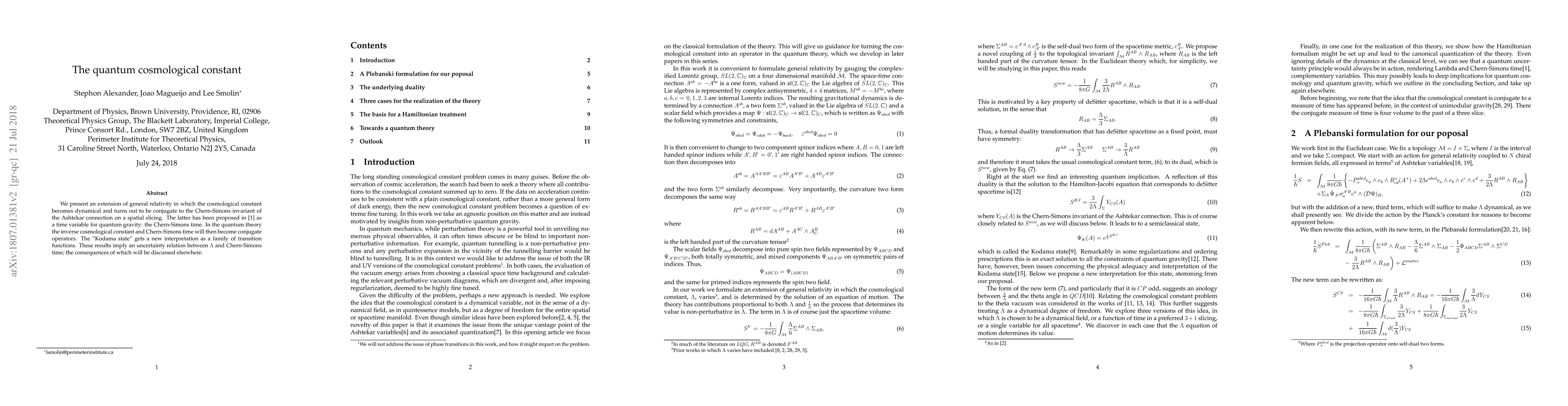 We present an extension of general relativity in which the cosmological constant becomes dynamical and turns out to be conjugate to the Chern-Simons invariant of the Ashtekar connection on a spatial slicing. The latter has been proposed in \cite{Chopin-Lee} as a time variable for quantum gravity: the Chern-Simons time. In the quantum theory the inverse cosmological constant and Chern-Simons time will then become conjugate operators. The "Kodama state" gets a new interpretation as a family of transition functions. These results imply an uncertainty relation between $\Lambda$ and Chern-Simons time; the consequences of which will be discussed elsewhere.