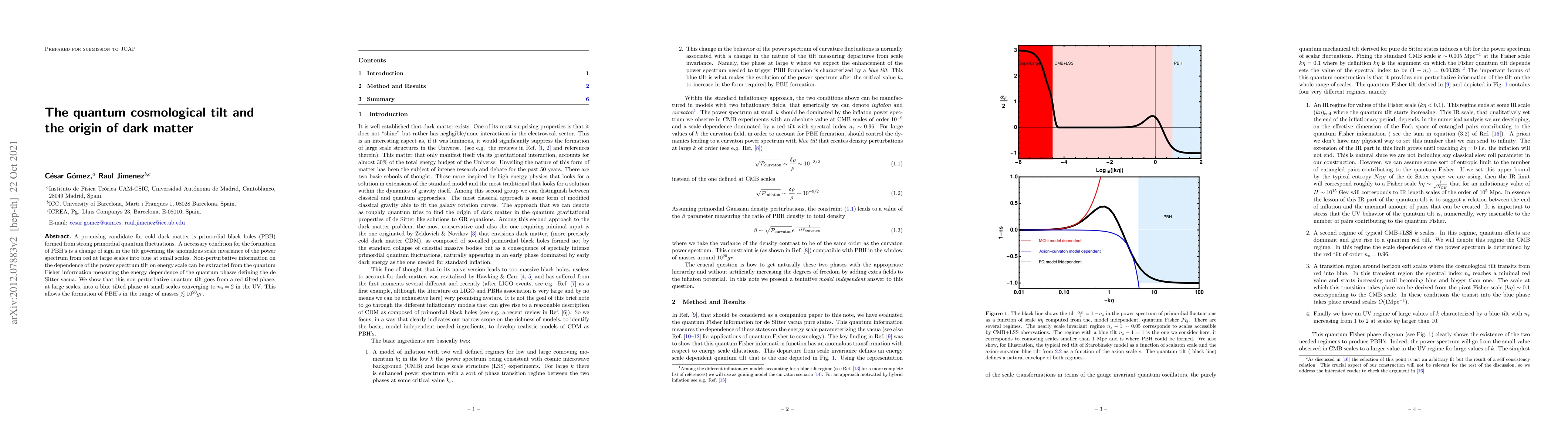 A promising candidate for cold dark matter is primordial black holes (PBH) formed from strong primordial quantum fluctuations. A necessary condition for the formation of PBH's is a change of sign in the tilt governing the anomalous scale invariance of the power spectrum from red at large scales into blue at small scales. Non-perturbative information on the dependence of the power spectrum tilt on energy scale can be extracted from the quantum Fisher information measuring the energy dependence of the quantum phases defining the de Sitter vacua. We show that this non-perturbative quantum tilt goes from a red tilted phase, at large scales, into a blue tilted phase at small scales converging to $n_s=2$ in the UV. This allows the formation of PBH's in the range of masses $\lesssim 10^{20} gr$.