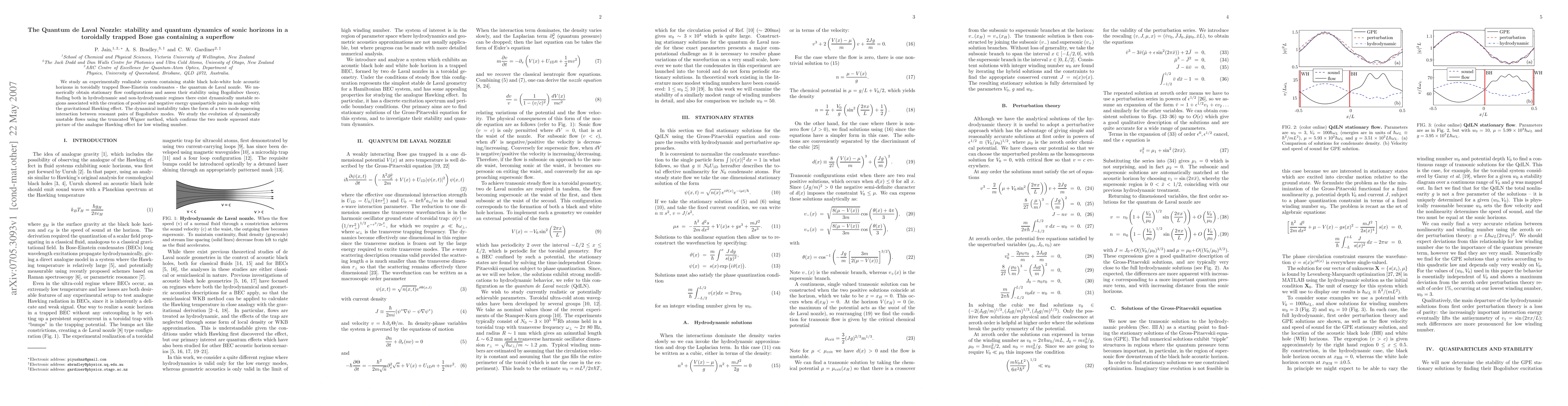 This paper investigates the quantum dynamics and stability of sonic horizons in a toroidally trapped Bose-Einstein condensate, termed the quantum de Laval nozzle, revealing dynamically unstable regions linked to quasiparticle pair creation akin to the Hawking effect. The study confirms the presence of a two-mode squeezing interaction through numerical simulations and the truncated Wigner method.