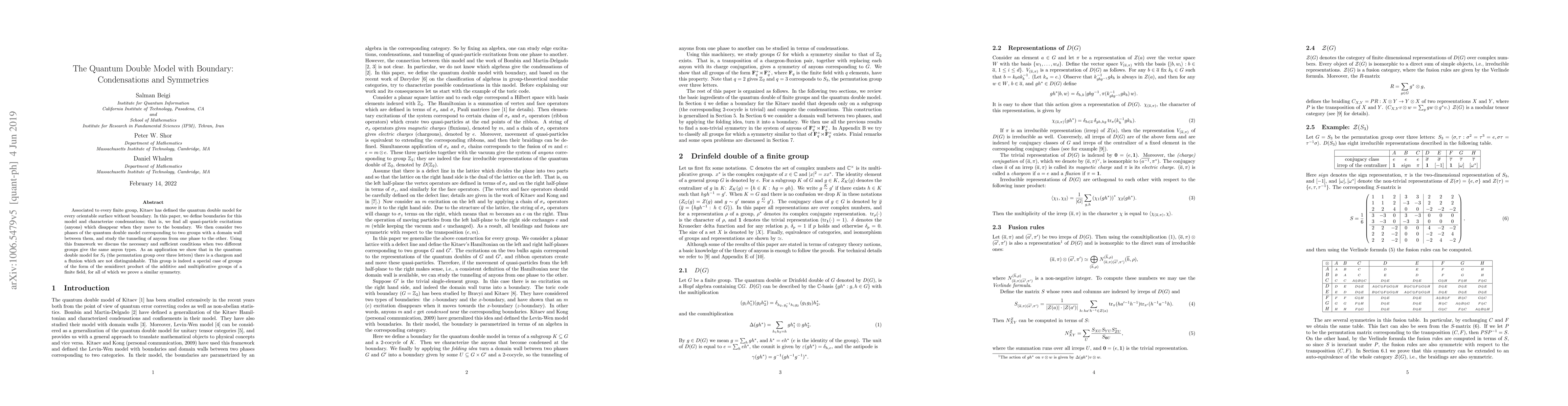 Associated to every finite group, Kitaev has defined the quantum double model for every orientable surface without boundary. In this paper, we define boundaries for this model and characterize condensations; that is, we find all quasi-particle excitations (anyons) which disappear when they move to the boundary. We then consider two phases of the quantum double model corresponding to two groups with a domain wall between them, and study the tunneling of anyons from one phase to the other. Using this framework we discuss the necessary and sufficient conditions when two different groups give the same anyon types. As an application we show that in the quantum double model for S_3 (the permutation group over three letters) there is a chargeon and a fluxion which are not distinguishable. This group is indeed a special case of groups of the form of the semidirect product of the additive and multiplicative groups of a finite field, for all of which we prove a similar symmetry.