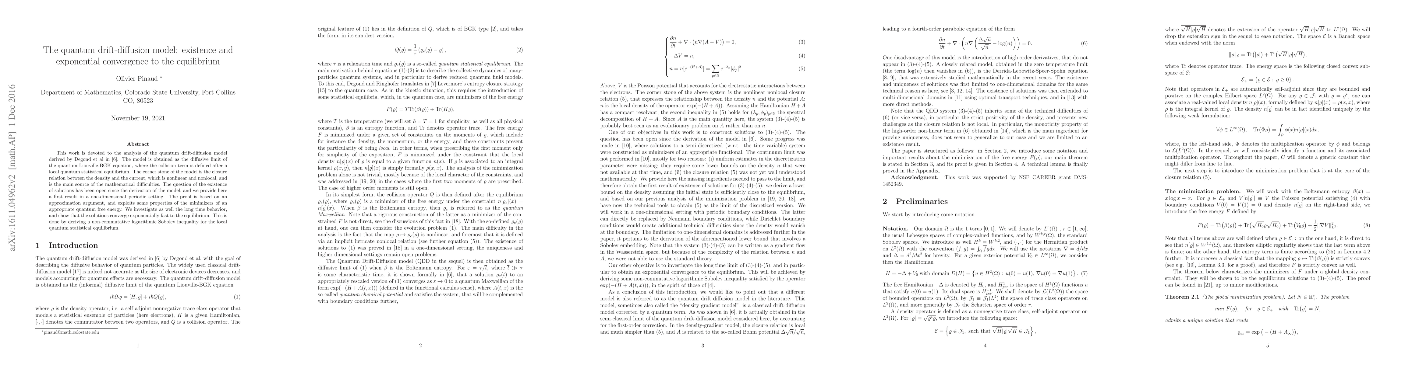 The quantum drift-diffusion model has been analyzed for existence and long-term behavior, with a proof showing that solutions converge exponentially fast to equilibrium in a one-dimensional periodic setting.