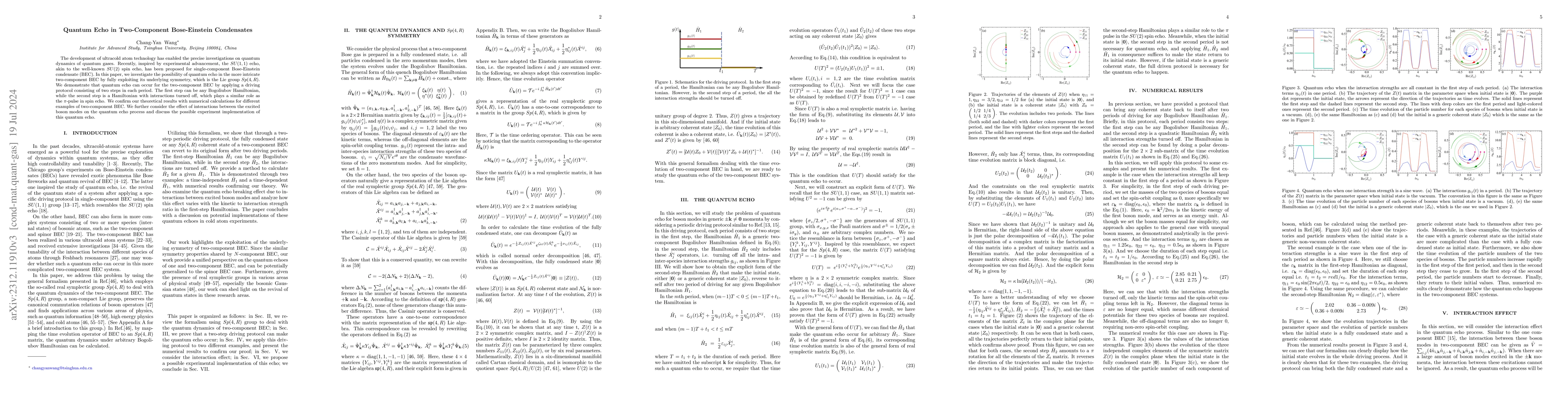 This paper explores the feasibility of quantum echo in two-component Bose-Einstein condensates (BEC) using the $Sp(4,R)$ symmetry. It proposes a two-step driving protocol to achieve quantum echo, confirming theoretical results with numerical calculations and discussing potential experimental implementations.