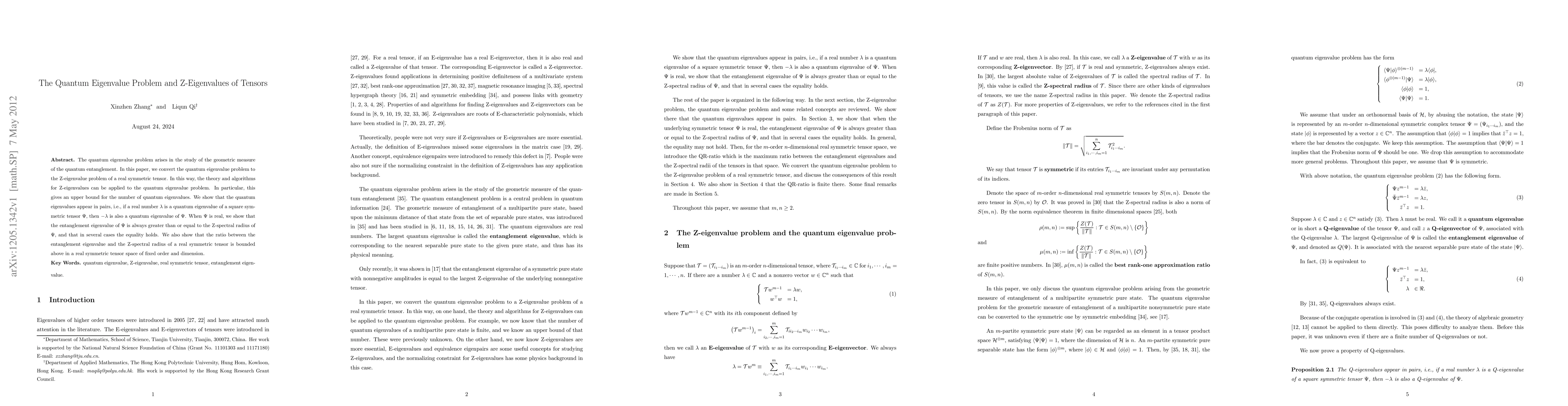This paper explores the quantum eigenvalue problem by converting it to the Z-eigenvalue problem of a real symmetric tensor, providing an upper bound for quantum eigenvalues and demonstrating that they appear in pairs. It also establishes the relationship between entanglement eigenvalues and Z-spectral radii for real symmetric tensors.