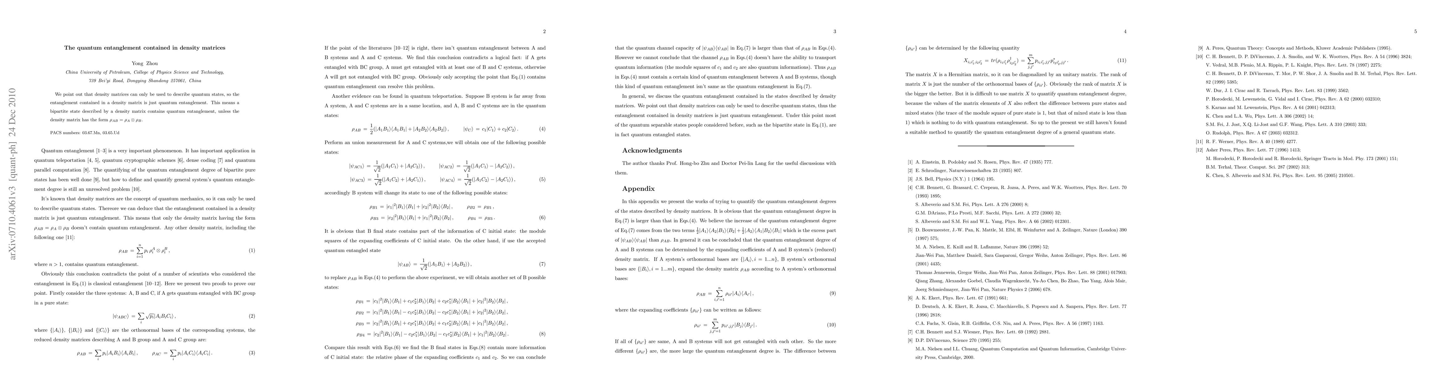 We point out that density matrices can only be used to describe quantum states, so the entanglement contained in a density matrix is just quantum entanglement. This means a bipartite state described by a density matrix contains quantum entanglement, unless the density matrix has the form $\rho_{AB}=\rho_A\otimes \rho_B$.