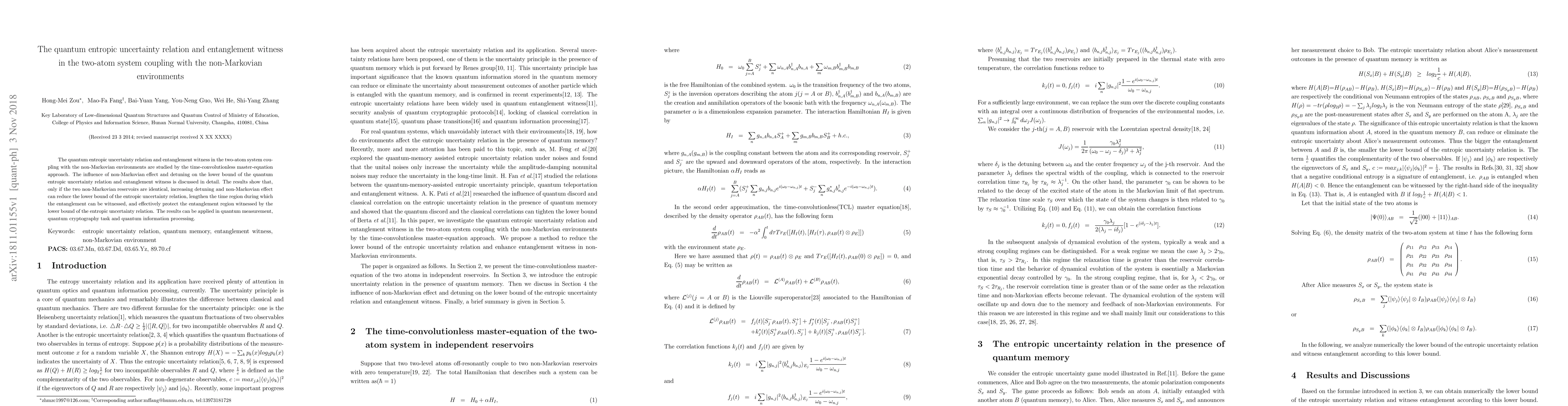 This paper investigates the quantum entropic uncertainty relation and entanglement witness in a two-atom system interacting with non-Markovian environments using the time-convolutionless master-equation approach. It reveals that identical non-Markovian reservoirs, along with increased detuning and non-Markovian effects, can lower the entropic uncertainty relation's lower bound, extend the entanglement witness duration, and enhance entanglement protection, with implications for quantum measurement, cryptography, and information processing.