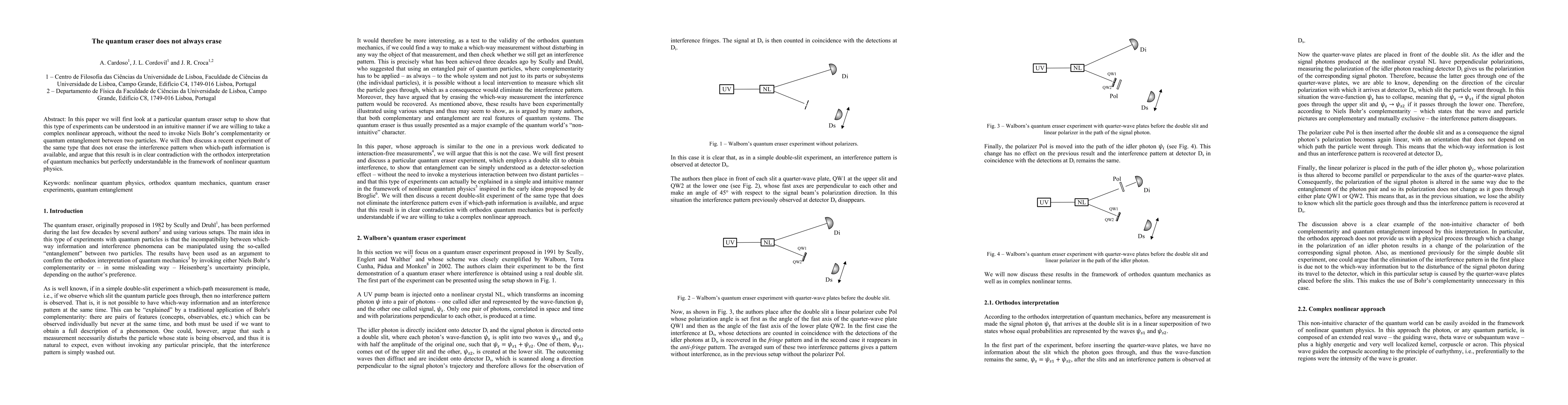 In this paper we will first look at a particular quantum eraser setup to show that this type of experiments can be understood in an intuitive manner if we are willing to take a complex nonlinear approach, without the need to invoke Niels Bohr's complementarity or quantum entanglement between two particles. We will then discuss a recent experiment of the same type that does not erase the interference pattern when which-path information is available, and argue that this result is in clear contradiction with the orthodox interpretation of quantum mechanics but perfectly understandable in the framework of nonlinear quantum physics.