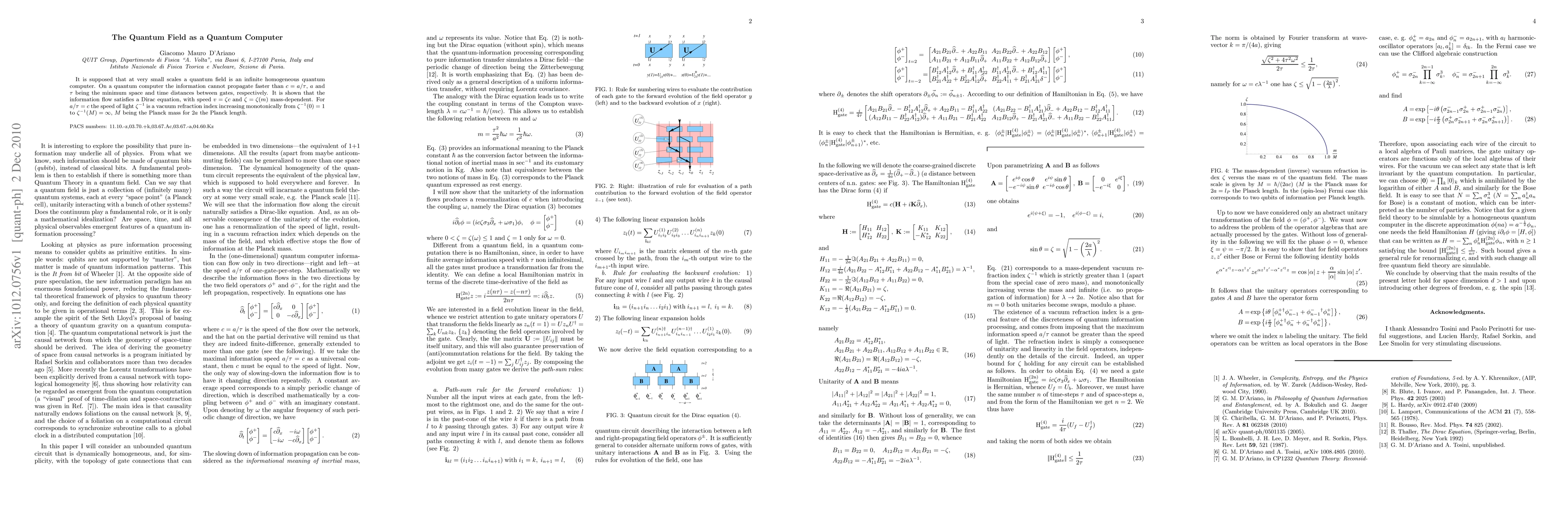 This paper posits that a quantum field functions as an infinite, homogeneous quantum computer where information propagation is constrained by the speed of light. The study reveals that information flow adheres to a Dirac equation, with a mass-dependent speed, and suggests a monotonic increase in the vacuum refraction index from 1 to infinity as mass approaches the Planck mass.