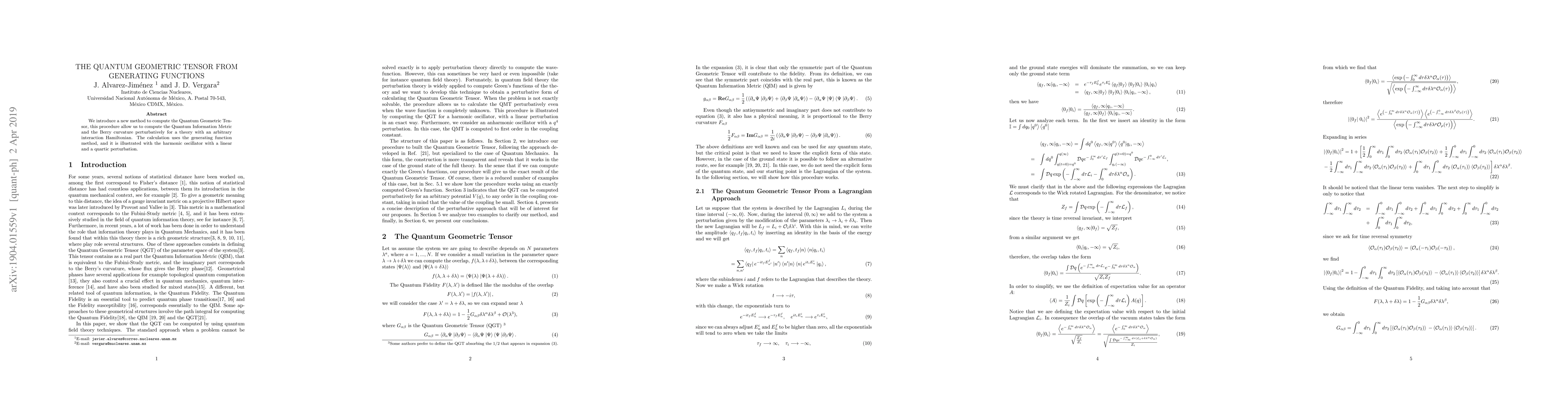 We introduce a new method to compute the Quantum Geometric Tensor, this procedure allows us to compute the Quantum Information Metric and the Berry curvature perturbatively for a theory with an arbitrary interaction Hamiltonian. The calculation uses the generating function method, and it is illustrated with the harmonic oscillator with a linear and a quartic perturbation.