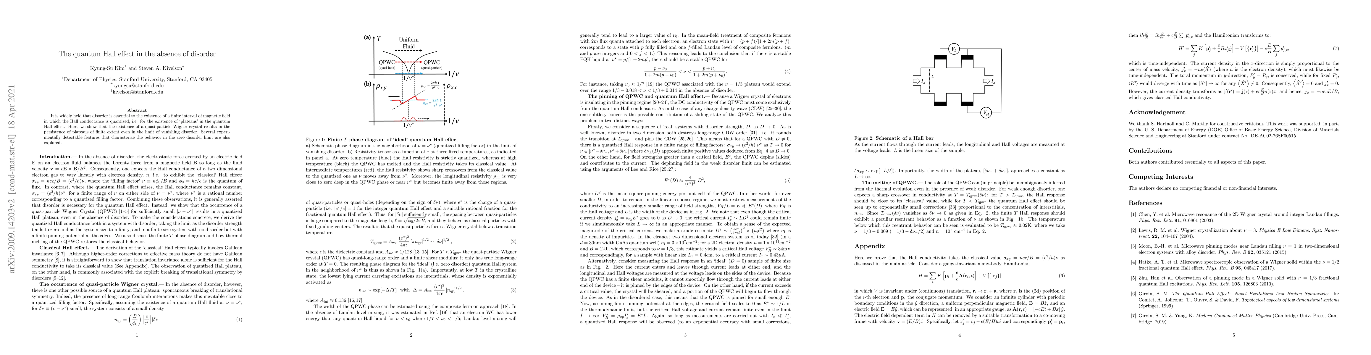 It is widely held that disorder is essential to the existence of a finite interval of magnetic field in which the Hall conductance is quantized, i.e. for the existence of `plateaus' in the quantum Hall effect. Here, we show that the existence of a quasi-particle Wigner crystal results in the persistence of plateaus of finite extent even in the limit of vanishing disorder. Several experimentally detectable features that characterize the behavior in the zero disorder limit are also explored.