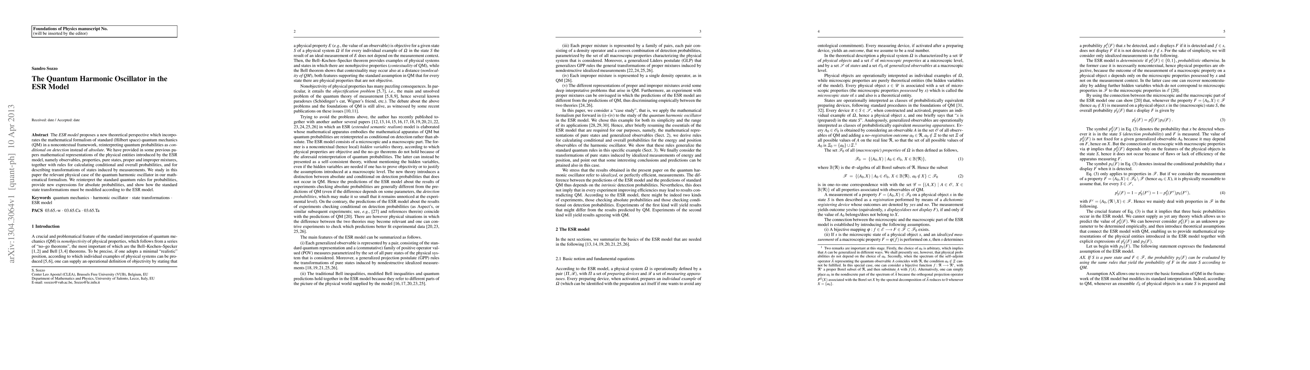 The ESR model proposes a new theoretical perspective which incorporates the mathematical formalism of standard (Hilbert space) quantum mechanics (QM) in a noncontextual framework, reinterpreting quantum probabilities as conditional on detection instead of absolute. We have provided in some previous papers mathematical representations of the physical entities introduced by the ESR model, namely observables, properties, pure states, proper and improper mixtures, together with rules for calculating conditional and overall probabilities, and for describing transformations of states induced by measurements. We study in this paper the relevant physical case of the quantum harmonic oscillator in our mathematical formalism. We reinterpret the standard quantum rules for probabilities, provide new expressions for absolute probabilities, and show how the standard state transformations must be modified according to the ESR model.