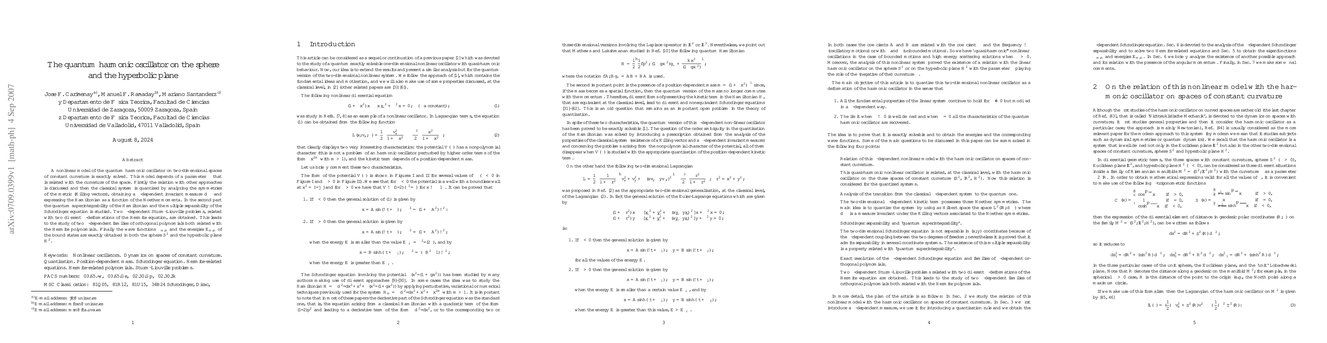 This paper exactly solves a nonlinear quantum harmonic oscillator model on spaces of constant curvature, deriving $\la$-dependent invariant measures and Hamiltonians. It explores quantum superintegrability and multiple separability, leading to $\la$-dependent Sturm-Liouville problems and families of orthogonal polynomials, ultimately obtaining exact wave functions and energies for both spherical and hyperbolic spaces.
