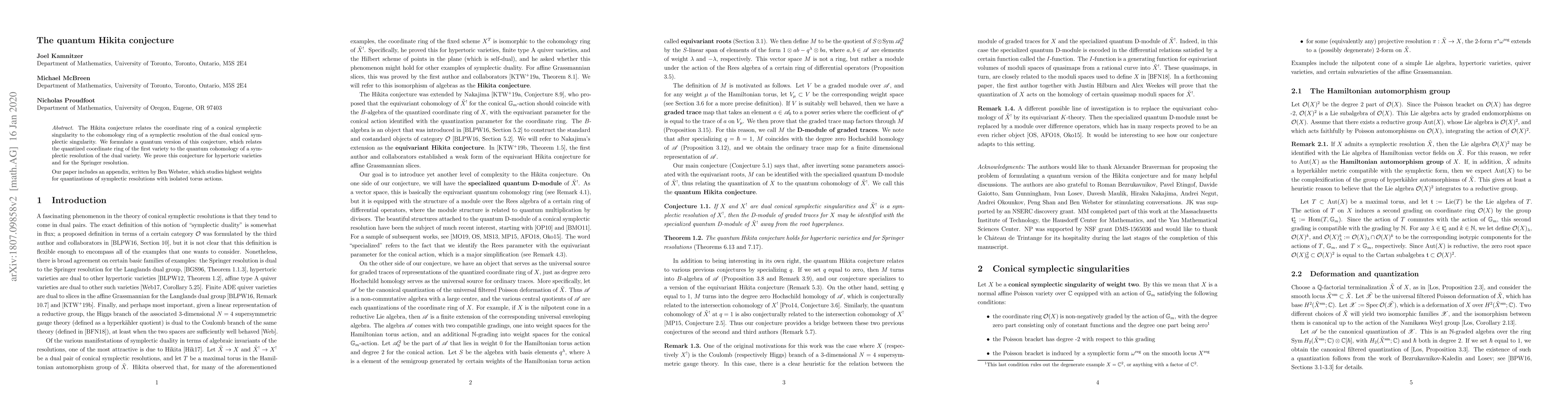 The paper formulates a quantum version of the Hikita conjecture, relating the quantized coordinate ring of a conical symplectic singularity to the quantum cohomology of its symplectic resolution. It proves this conjecture for hypertoric varieties and the Springer resolution, with an appendix by Ben Webster on highest weights for quantizations of symplectic resolutions.
