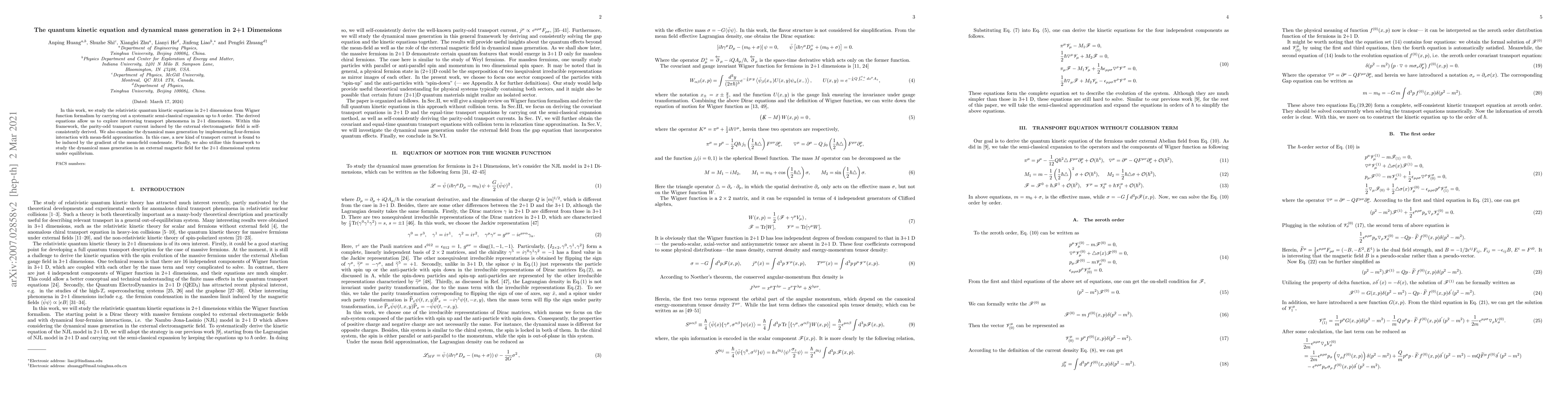 The research derives relativistic quantum kinetic equations for massive fermions with NJL interactions in 2+1D from the Wigner function formalism, using a semi-classical expansion up to $\hbar$ order.