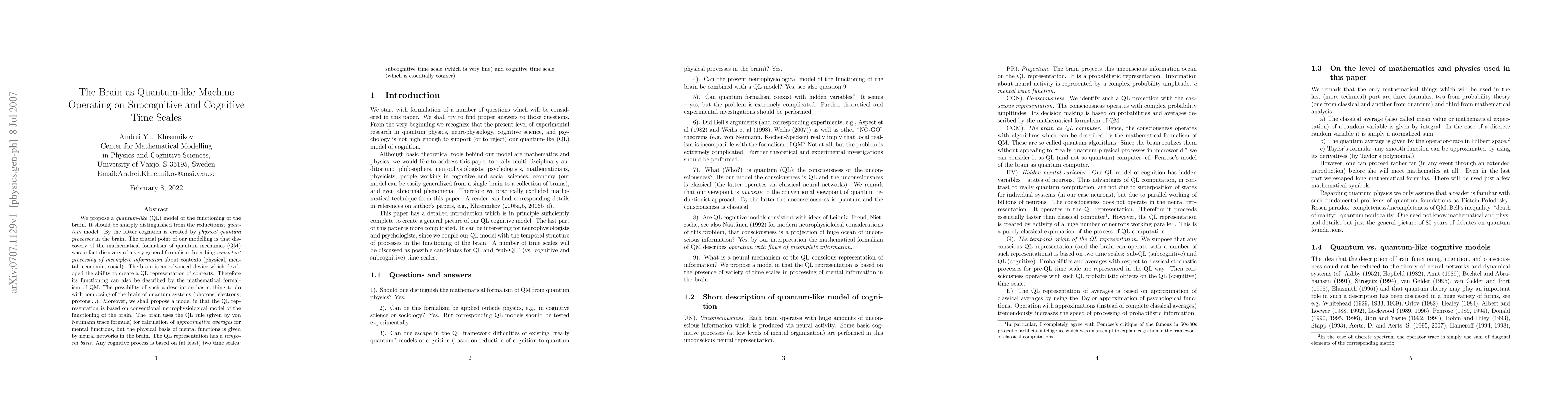 We propose a {\it quantum-like} (QL) model of the functioning of the brain. It should be sharply distinguished from the reductionist {\it quantum} model. By the latter cognition is created by {\it physical quantum processes} in the brain. The crucial point of our modelling is that discovery of the mathematical formalism of quantum mechanics (QM) was in fact discovery of a very general formalism describing {\it consistent processing of incomplete information} about contexts (physical, mental, economic, social). The brain is an advanced device which developed the ability to create a QL representation of contexts. Therefore its functioning can also be described by the mathematical formalism of QM. The possibility of such a description has nothing to do with composing of the brain of quantum systems (photons, electrons, protons,...). Moreover, we shall propose a model in that the QL representation is based on conventional neurophysiological model of the functioning of the brain. The brain uses the QL rule (given by von Neumann trace formula) for calculation of {\it approximative averages} for mental functions, but the physical basis of mental functions is given by neural networks in the brain. The QL representation has a {\it temporal basis.} Any cognitive process is based on (at least) two time scales: subcognitive time scale (which is very fine) and cognitive time scale (which is essentially coarser).