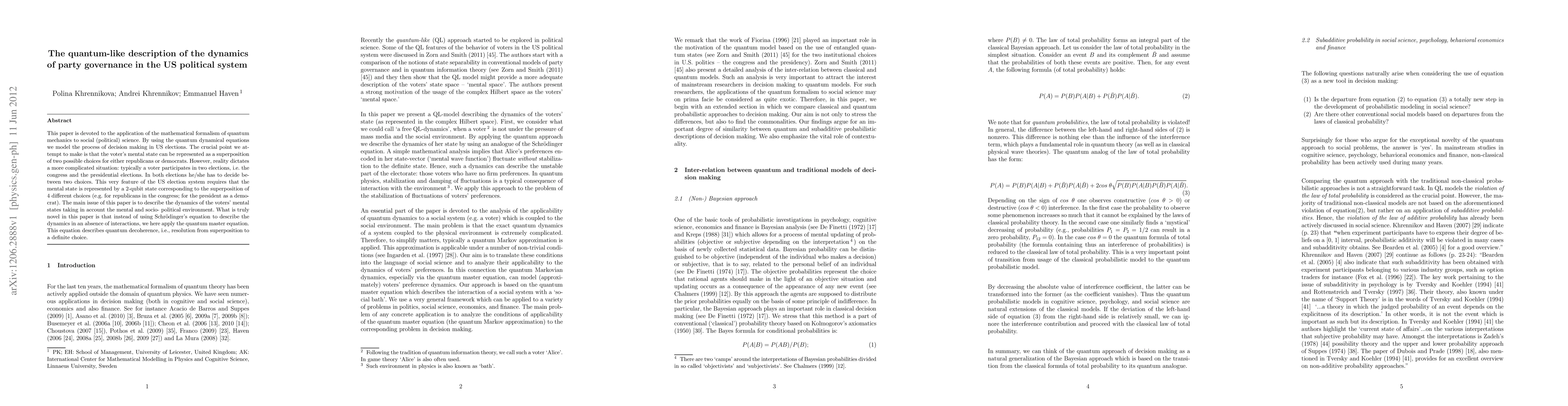 This paper is devoted to the application of the mathematical formalism of quantum mechanics to social (political) science. By using the quantum dynamical equations we model the process of decision making in US elections. The crucial point we attempt to make is that the voter's mental state can be represented as a superposition of two possible choices for either republicans or democrats. However, reality dictates a more complicated situation: typically a voter participates in two elections, i.e. the congress and the presidential elections. In both elections he/she has to decide between two choices. This very feature of the US election system requires that the mental state is represented by a 2-qubit state corresponding to the superposition of 4 different choices (e.g. for republicans in the congress; for the president as a democrat). The main issue of this paper is to describe the dynamics of the voters' mental states taking in account the mental and socio- political environment. What is truly novel in this paper is that instead of using Schr\"odinger's equation to describe the dynamics in an absence of interactions, we here apply the quantum master equation. This equation describes quantum decoherence, i.e., resolution from superposition to a definite choice.