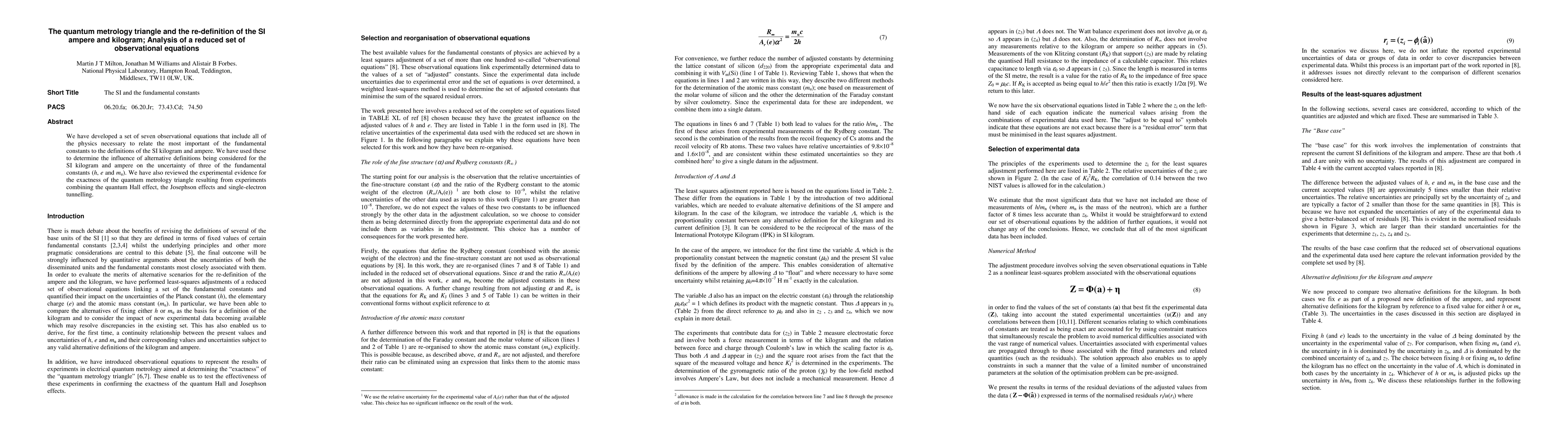 This paper develops a set of seven observational equations to relate fundamental constants to the SI definitions of the kilogram and ampere, assessing the impact of alternative definitions on the uncertainties of h, e, and mu. It also examines experimental evidence supporting the quantum metrology triangle formed by the quantum Hall effect, Josephson effects, and single-electron tunneling.
