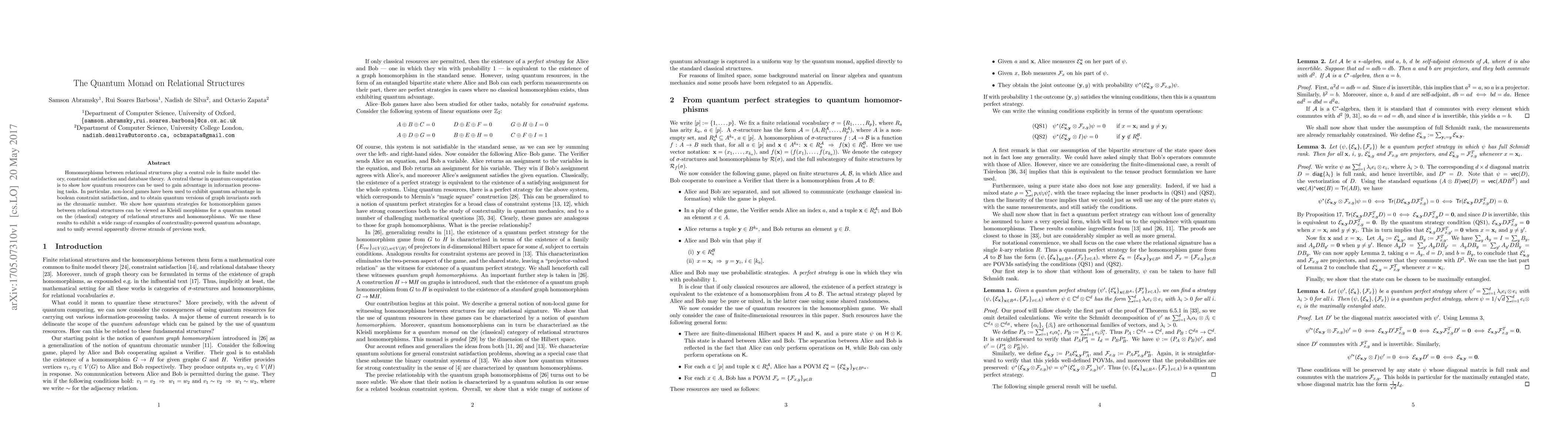 This paper explores how quantum strategies for homomorphism games between relational structures can be framed as Kleisli morphisms for a quantum monad, revealing a connection to state-independent quantum contextuality and demonstrating quantum advantage in various information processing tasks.