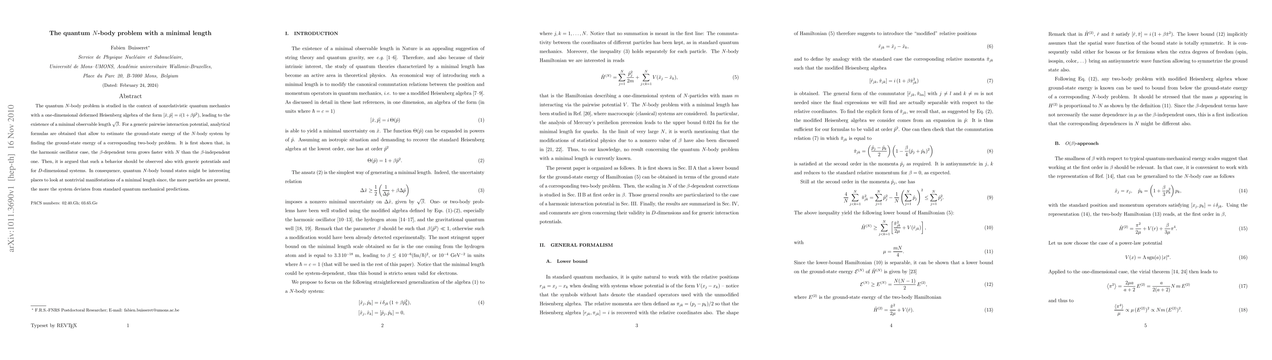 Researchers studied a quantum $N$-body problem with a minimal length, finding that ground-state energy grows faster with $N$ for harmonic oscillator cases, suggesting this phenomenon might occur for generic potentials and higher dimensions.