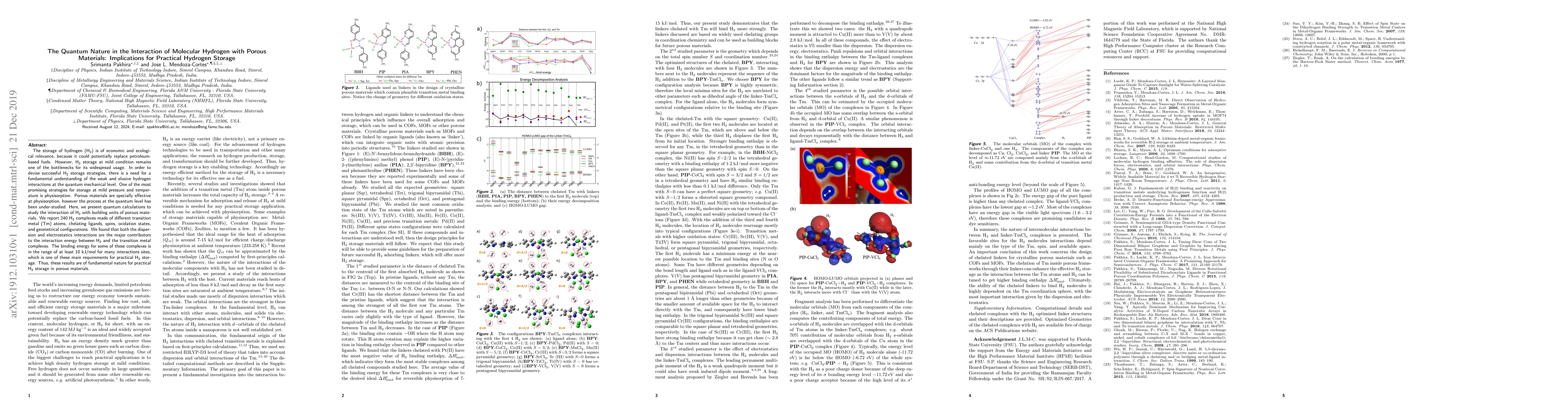 This paper investigates the quantum mechanical interactions between molecular hydrogen (H$_2$) and building units of porous materials, revealing that both dispersion and electrostatic interactions significantly contribute to H$_2$ binding energies. The findings suggest that certain transition metal complexes can achieve binding energies of at least 10 kJ/mol, meeting a key requirement for practical hydrogen storage.