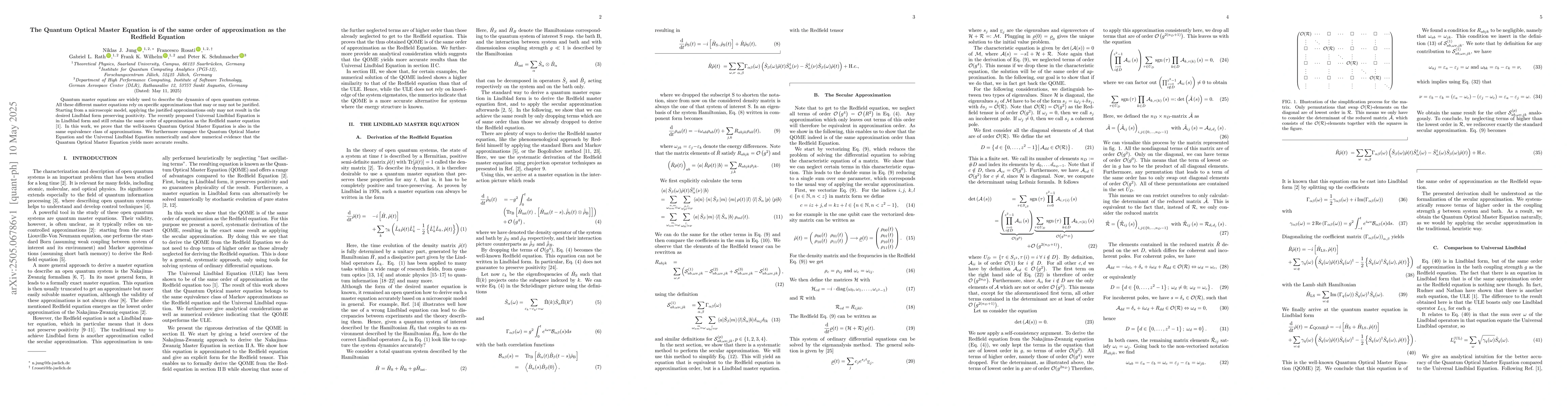 This research distinguishes itself by proving the QOME's position within the same approximation class as the Redfield Equation and demonstrating its superior numerical performance compared to the Universal Lindblad Equation.