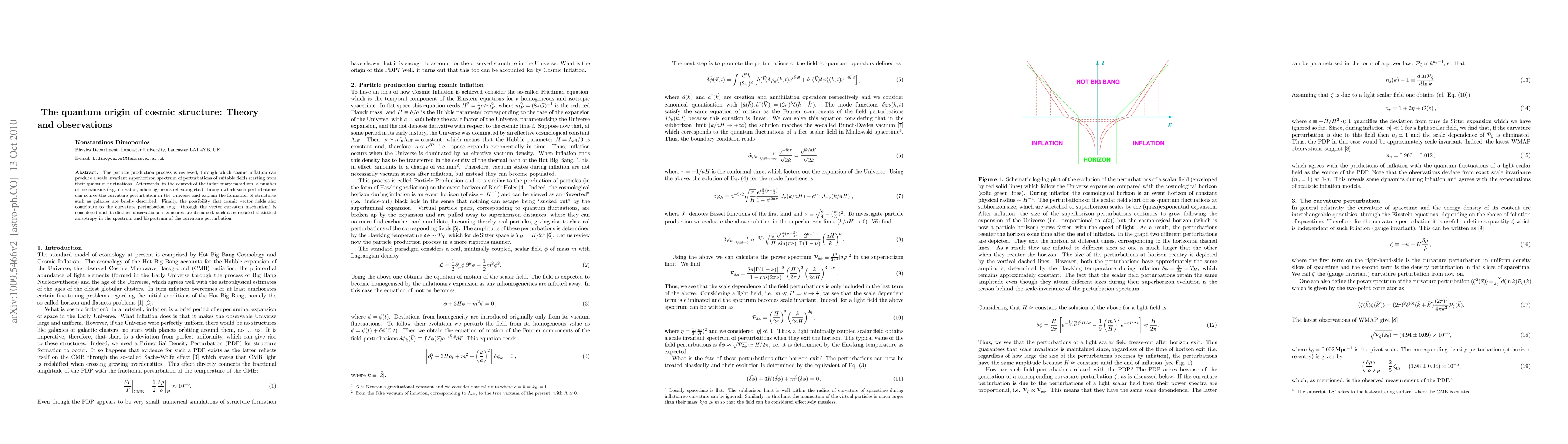 The particle production process is reviewed, through which cosmic inflation can produce a scale invariant superhorizon spectrum of perturbations of suitable fields starting from their quantum fluctuations. Afterwards, in the context of the inflationary paradigm, a number of mechanisms (e.g. curvaton, inhomogeneous reheating etc.) through which such perturbations can source the curvature perturbation in the Universe and explain the formation of structures such as galaxies are briefly described. Finally, the possibility that cosmic vector fields also contribute to the curvature perturbation (e.g. through the vector curvaton mechanism) is considered and its distinct observational signatures are discussed, such as correlated statistical anisotropy in the spectrum and bispectrum of the curvature perturbation.