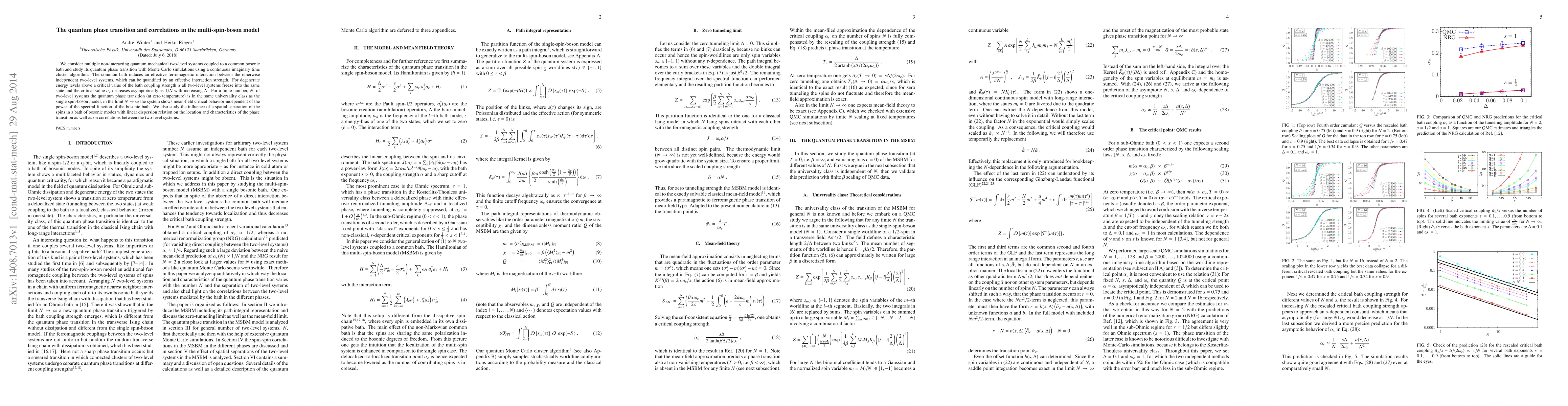 We consider multiple non-interacting quantum mechanical two-level systems coupled to a common bosonic bath and study its quantum phase transition with Monte Carlo simulations using a continuous imaginary time cluster algorithm. The common bath induces an effective ferromagnetic interaction between the otherwise independent two-level systems, which can be quantified by an effective interaction strength. For degenerate energy levels above a critical value of the bath coupling strength $\alpha$ all two-level systems freeze into the same state and the critical value $\alpha_c$ decreases asymptotically as $1/N$ with increasing $N$. For a finite number, $N$, of two-level systems the quantum phase transition (at zero temperature) is in the same universality class as the single spin-boson model, in the limit $N\to\infty$ the system shows mean-field critical behavior independent of the power of the spectral function of the bosonic bath. We also study the influence of a spatial separation of the spins in a bath of bosonic modes with linear dispersion relation on the location and characteristics of the phase transition as well as on correlations between the two-level systems.