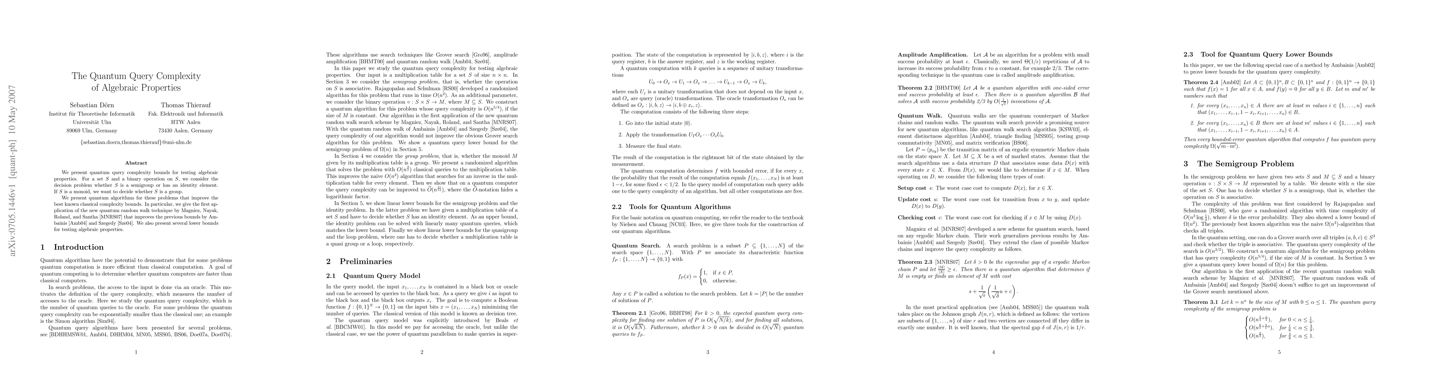 This paper introduces quantum algorithms that significantly improve classical query complexity bounds for testing algebraic properties, such as whether a set is a semigroup, has an identity element, or is a group. It leverages a novel quantum random walk technique to achieve these improvements.